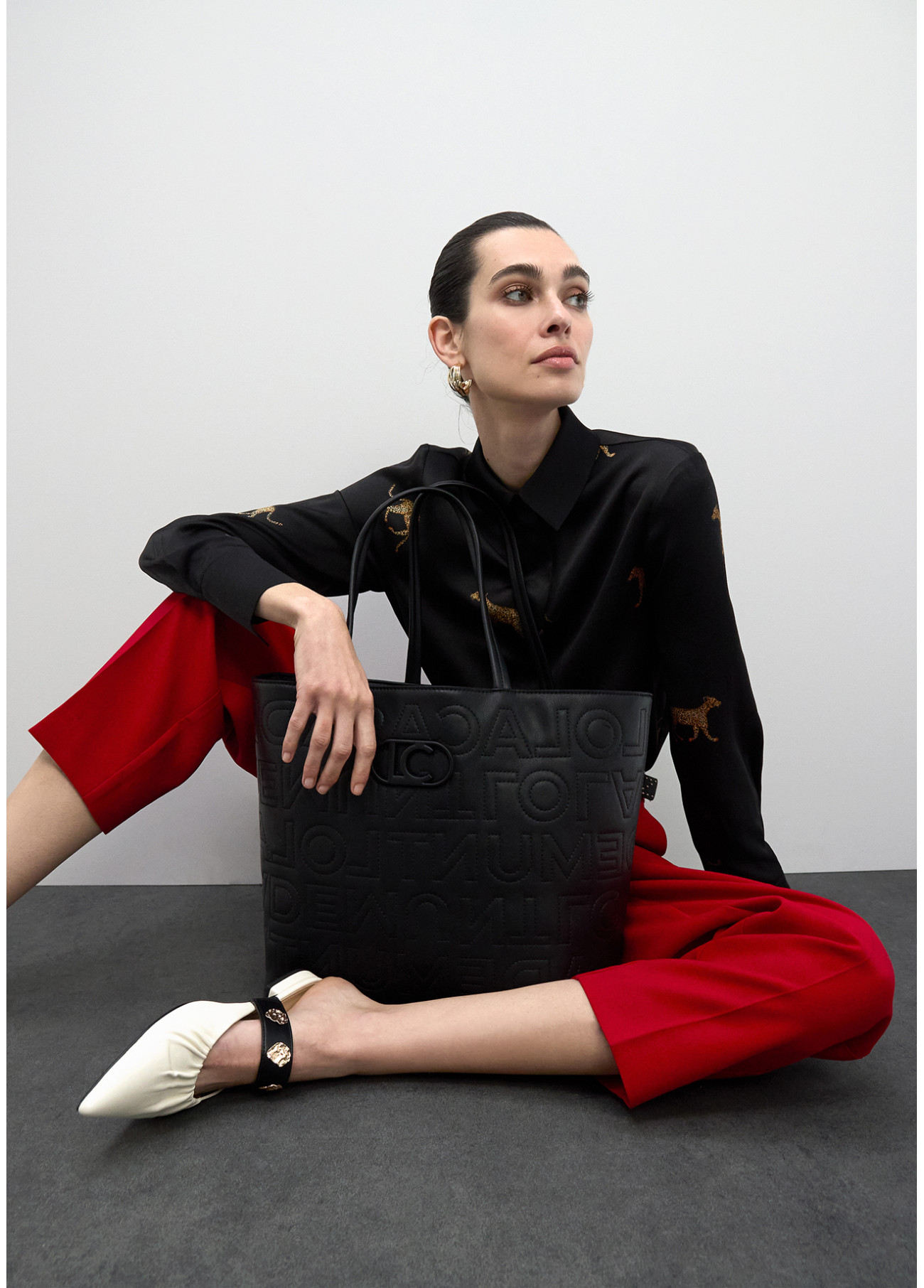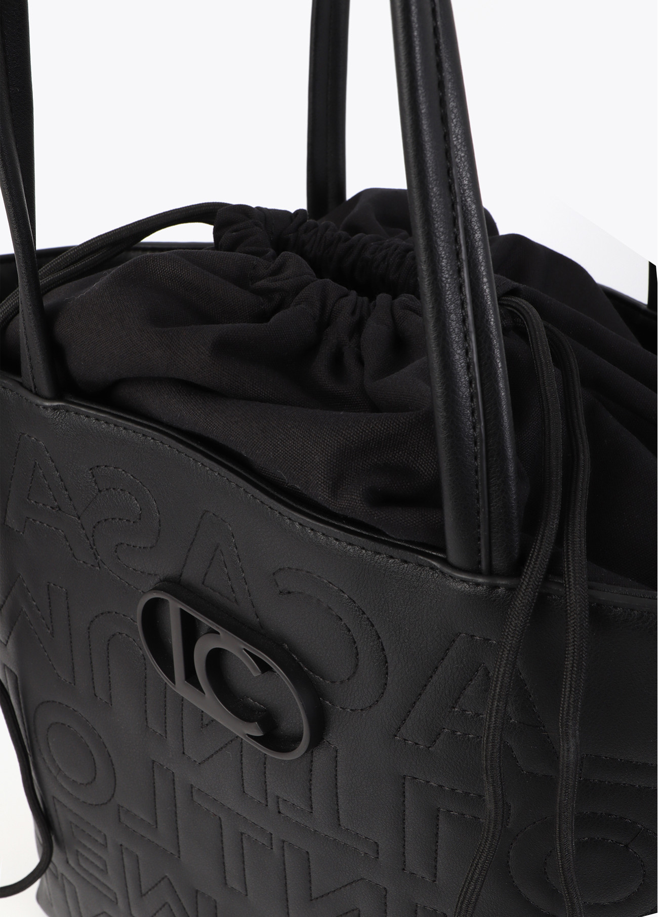 Sac shopper déstructuré élégant avec surpiqûres monogrammes distinctives. Intérieur spacieux et fermeture à cordon. Allie style et fonctionnalité. Longues poignées pour un transport confortable.