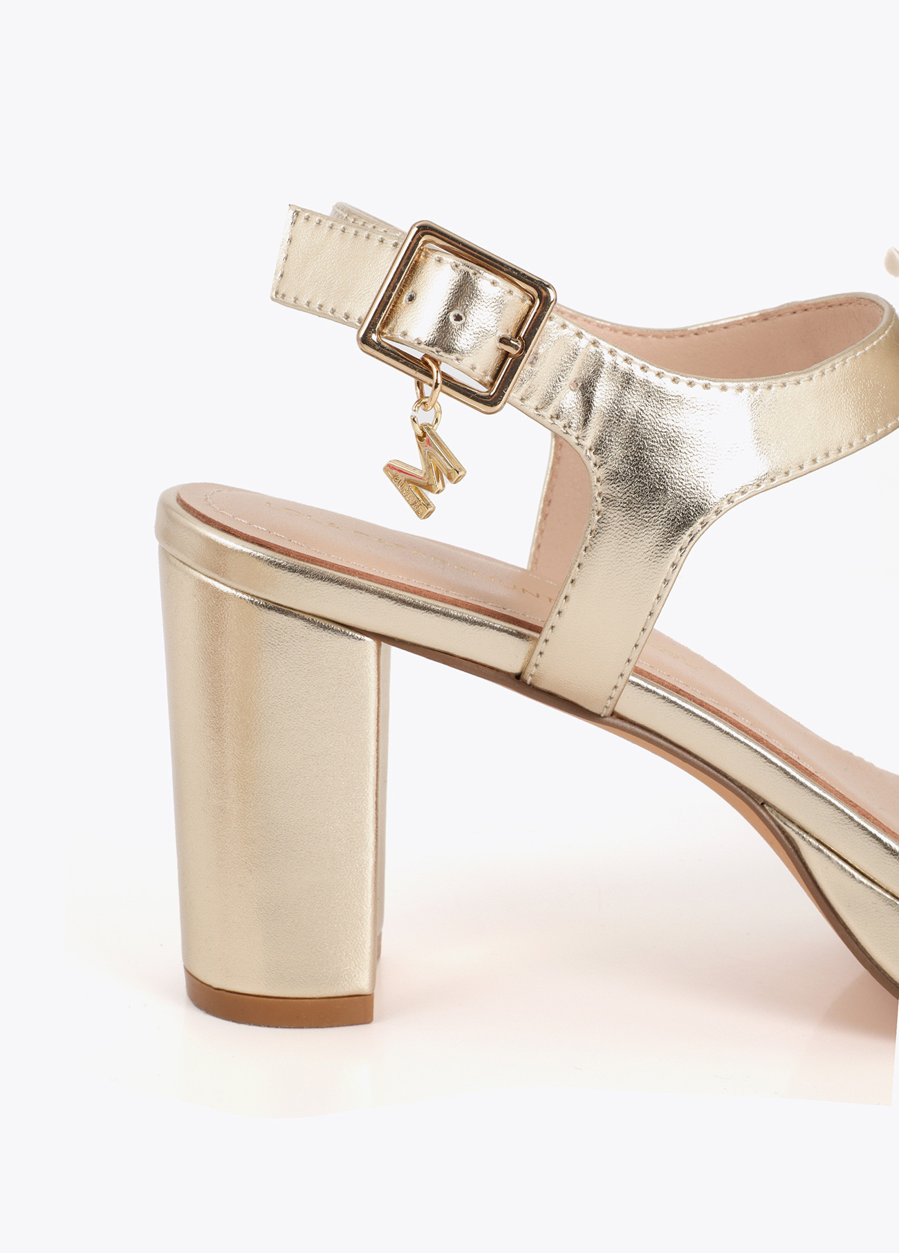 Sandale à talon dorée avec détails floraux. Boucle réglable et plateforme pour un look élégant et confortable. Parfaite pour les occasions spéciales.