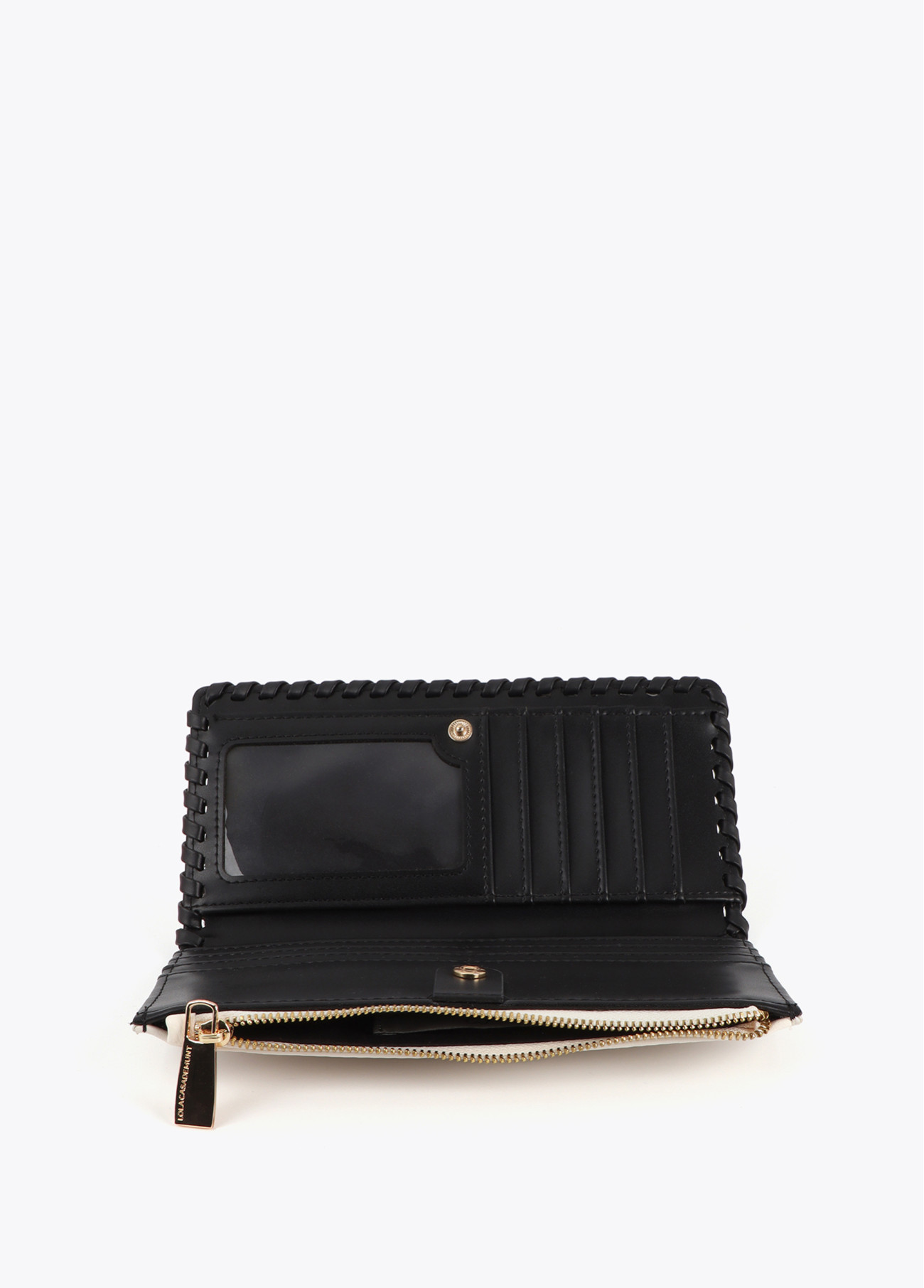 Portefeuille avec une finition contrastée élégante. Fermeture zippée. Compartiments intérieurs spacieux pour cartes et espace pour billets. Détails de couture visibles et logo métallique doré. Parfait pour apporter une touche de style à votre quotidien.