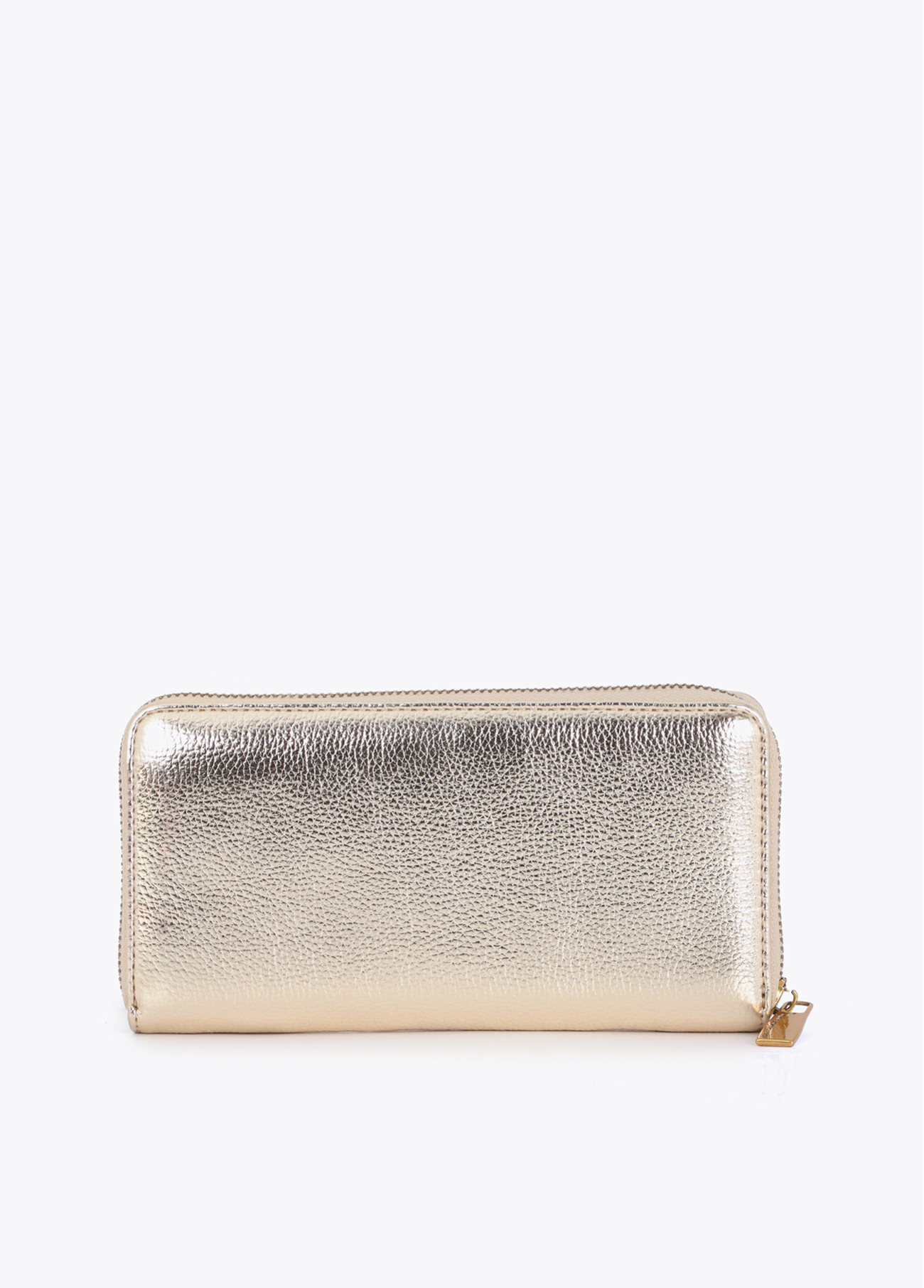 Portefeuille doré métallisé avec fermeture éclair et multiples compartiments internes. Finition brillante avec détail de logo doré. Parfait pour transporter avec style toutes vos cartes et espèces.