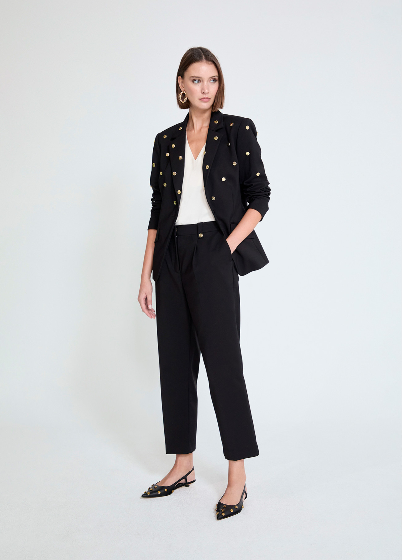 Pantalon élégant à coupe droite avec des détails de clous sur les passants. Confectionné en tissu de haute qualité, il offre un design sophistiqué idéal pour toute occasion. Fermeture éclair frontale et bouton, poches latérales fonctionnelles.
