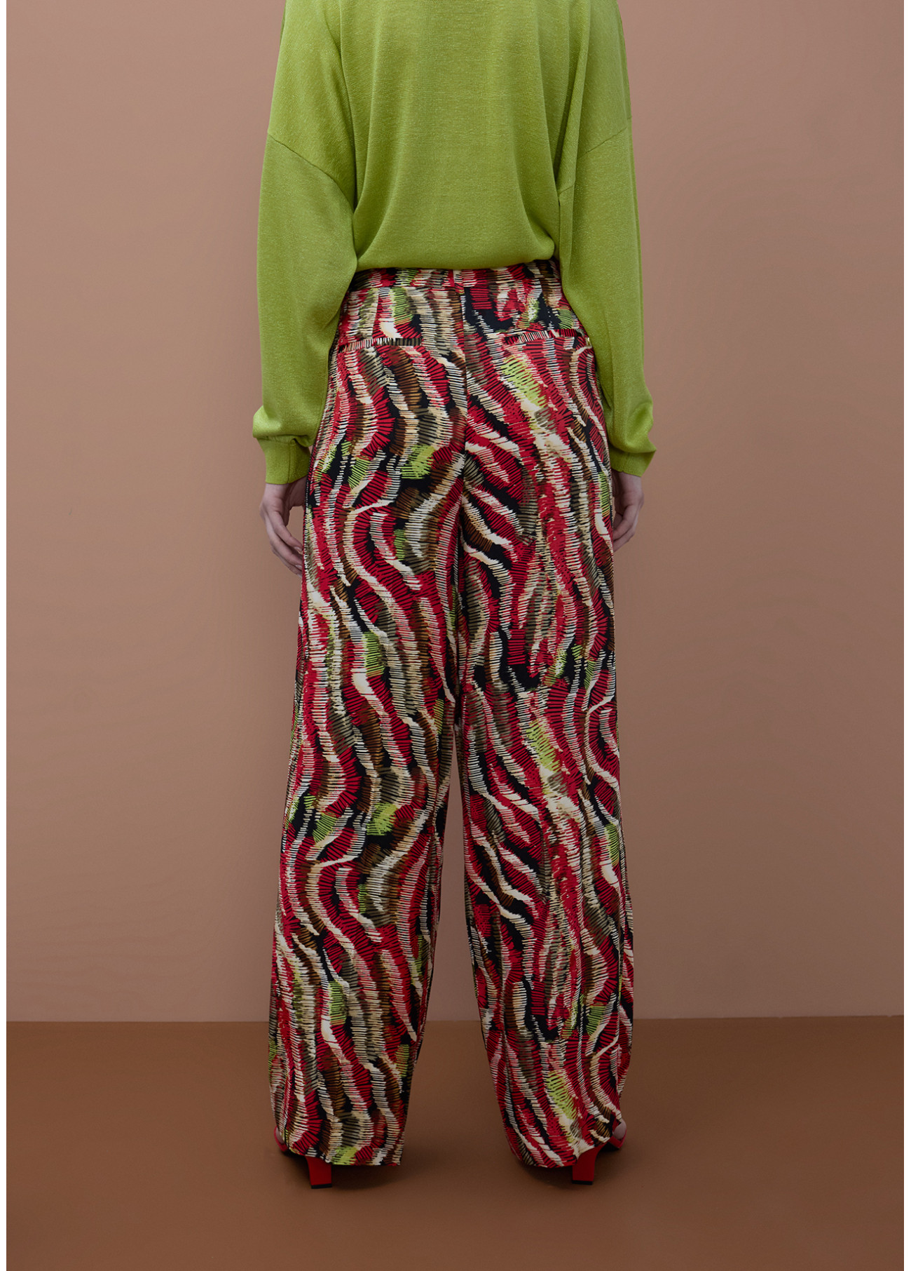 Ce pantalon satiné présente une coupe large qui offre élégance et confort. Son imprimé multicolore vibrant en fait une pièce unique. La taille haute et le tissu fluide flattent la silhouette, le rendant idéal pour toute occasion spéciale.