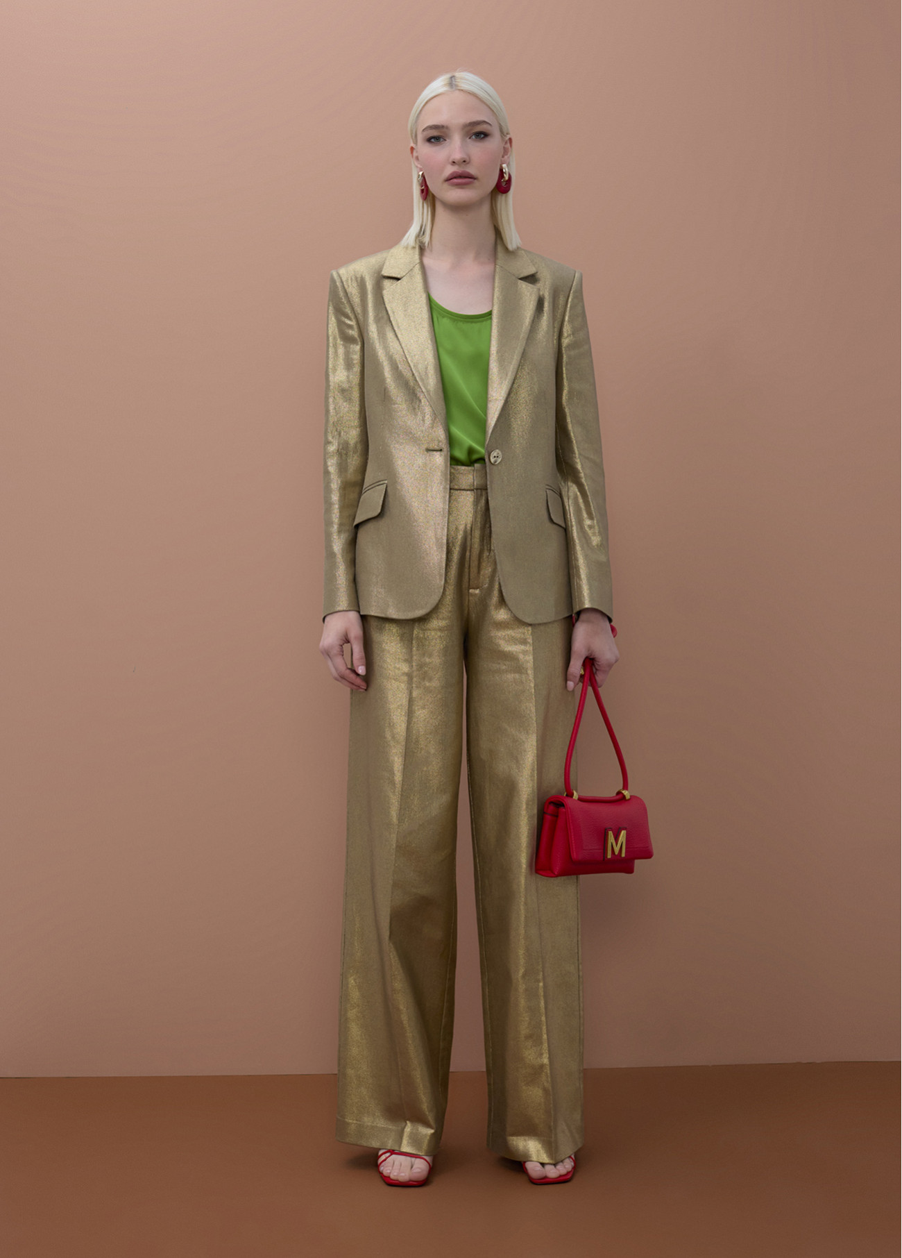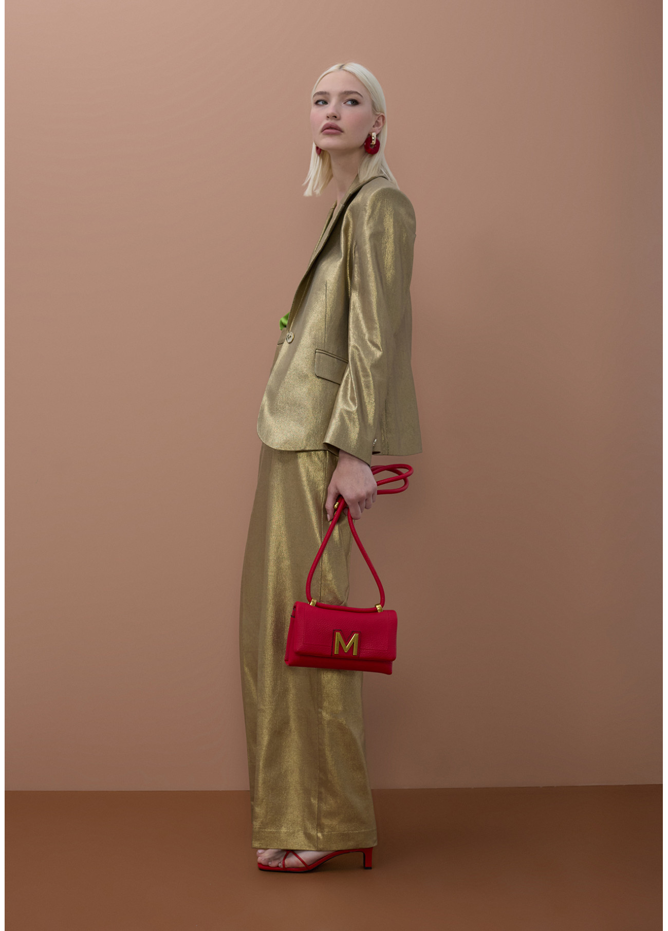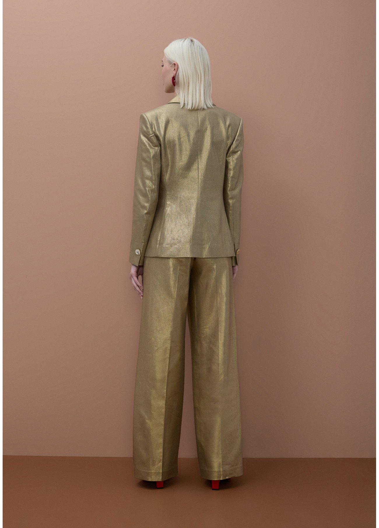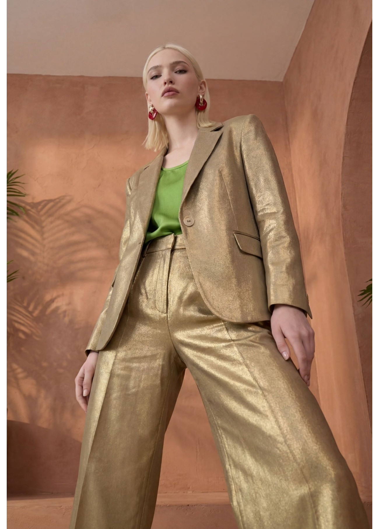 Pantalon culotte doré métallique. Avec une coupe large et taille haute, ce design élégant et moderne est parfait pour se démarquer lors de tout événement important. Confectionné dans un tissu de haute qualité qui apporte brillance et sophistication.