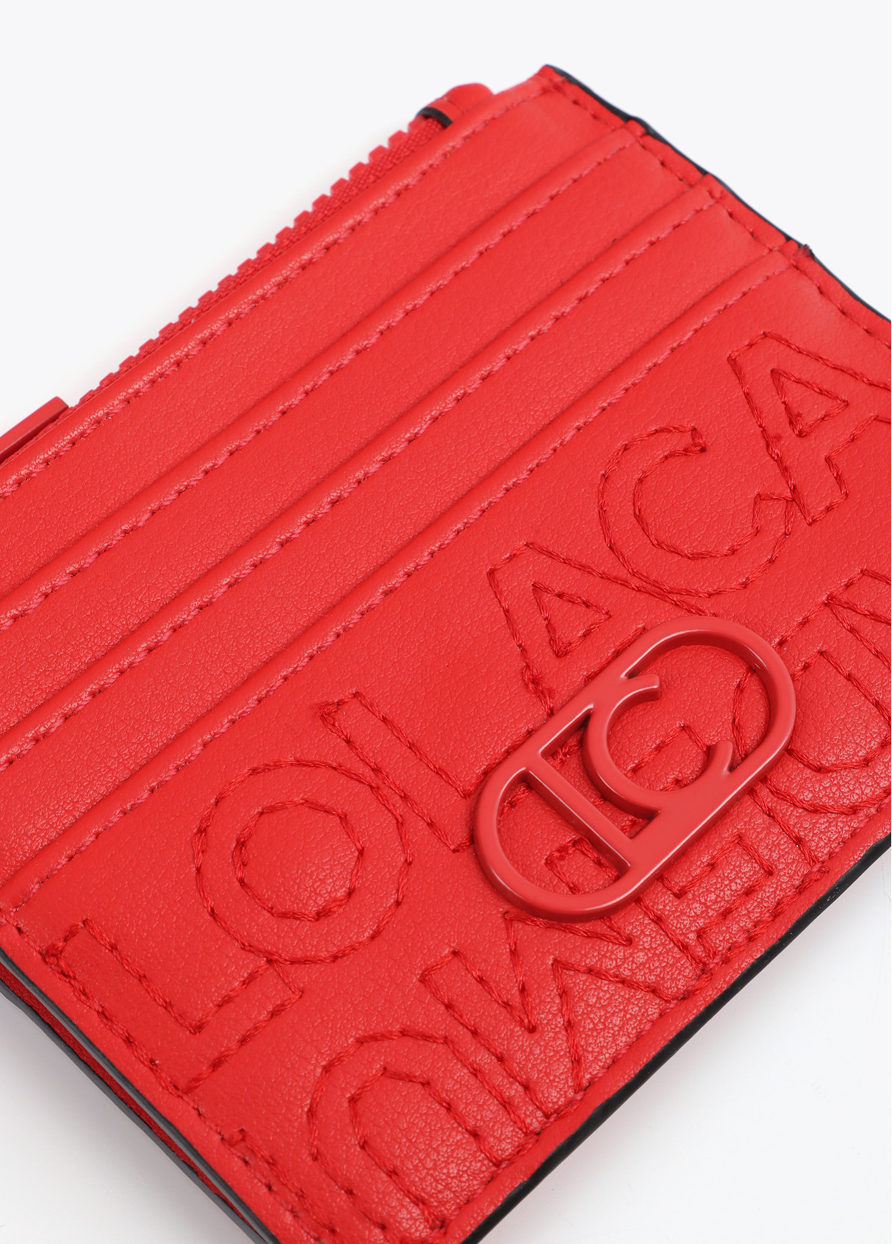 Porte-cartes compact rouge avec coutures élégantes et logo embossé. Organisez vos cartes avec style grâce à ses multiples fentes et compartiment zippé.