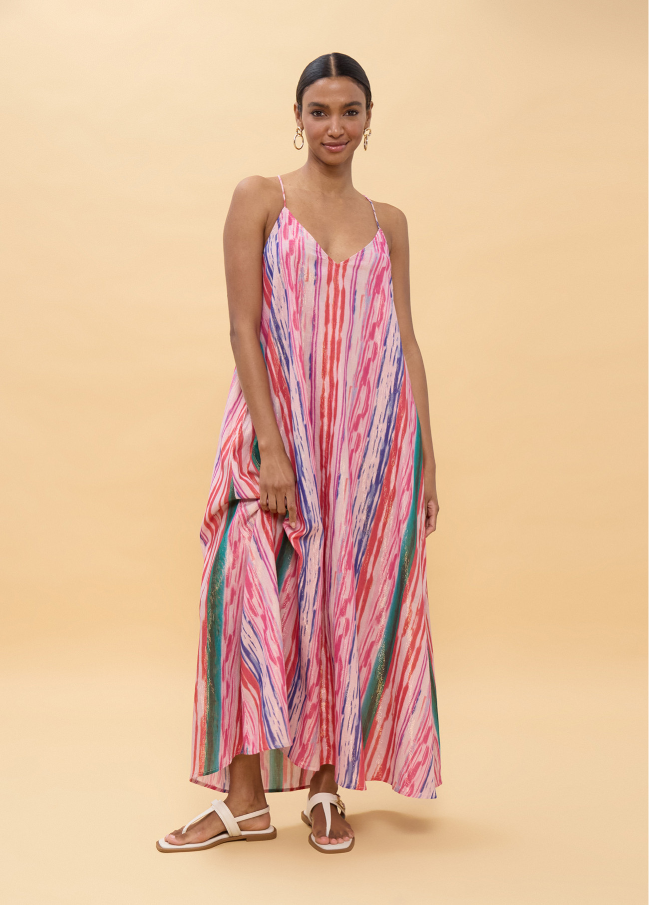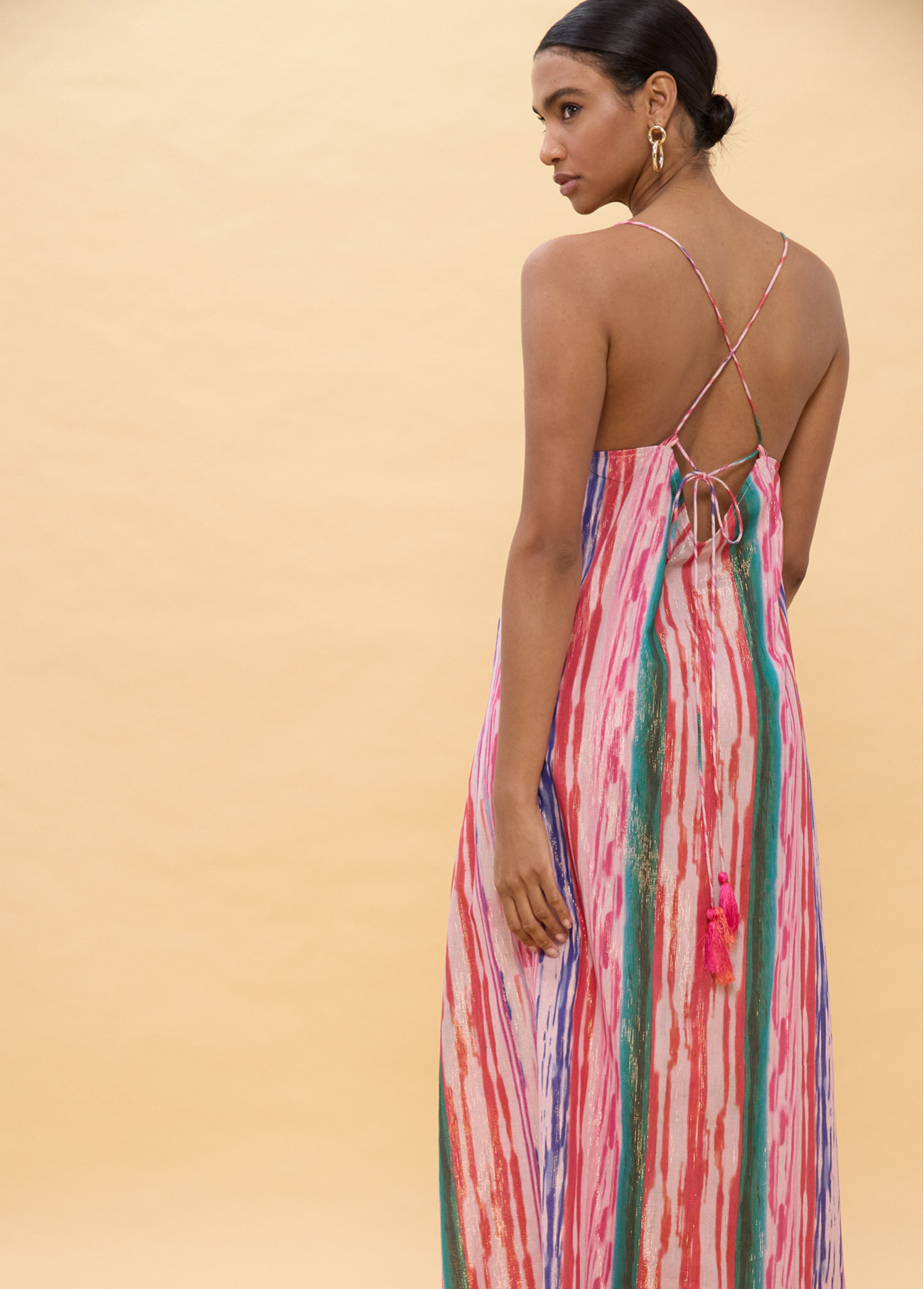 Robe longue à bretelles avec des rayures multicolores vibrantes et des détails en lurex. Conçue pour une coupe fluide, elle comporte un dos croisé ajustable. Parfaite pour se démarquer lors d'événements d'été ou de saison décontractée.