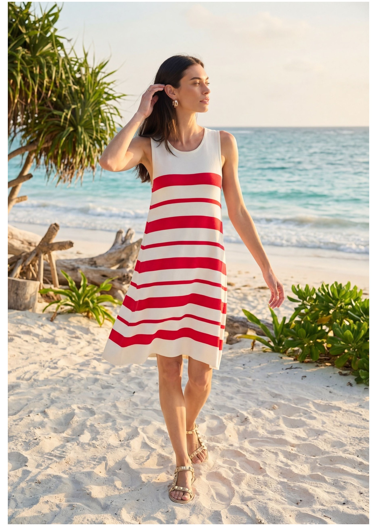 Robe en maille courte à larges bretelles évasée à rayures irrégulières