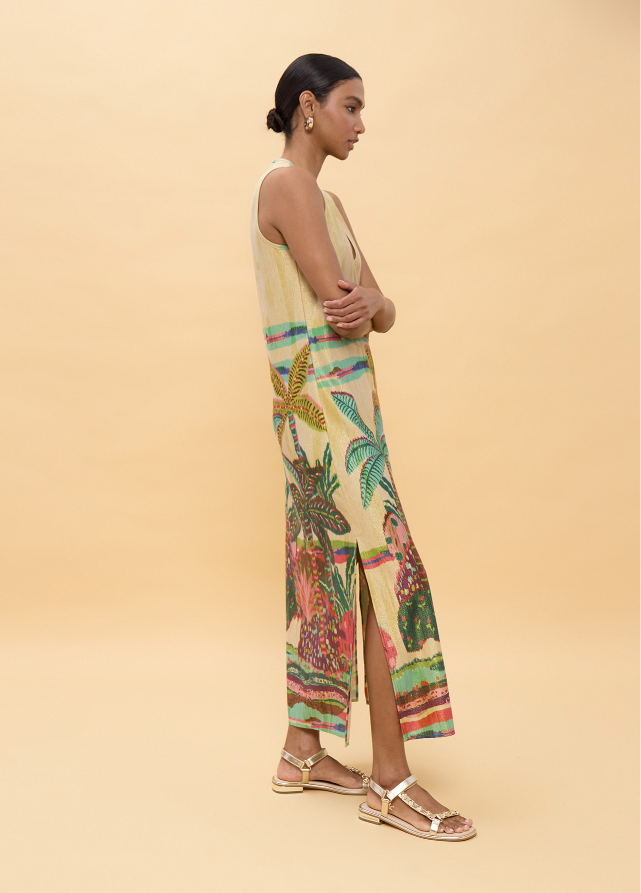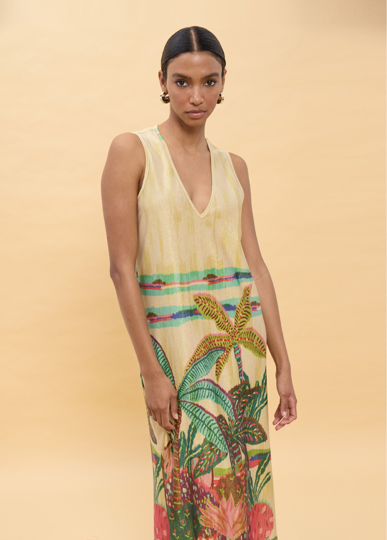 Robe à coupe circulaire avec imprimé tropical vibrant. Tissu léger idéal pour les jours chauds. Décolleté en V et design sans manches ajoutent sophistication et confort. Ourlet fendu latéral pour plus de liberté de mouvement.