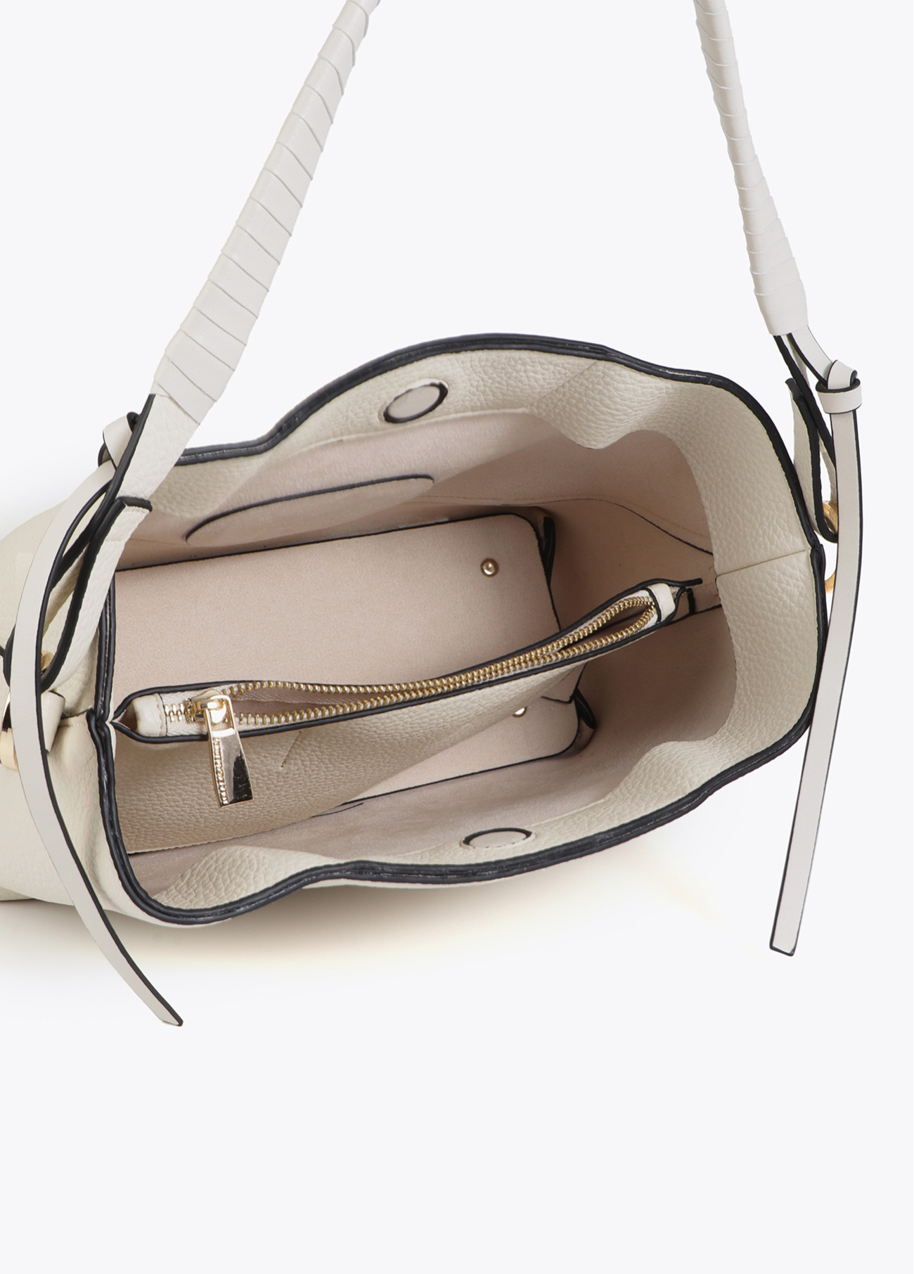 Bandoulière élégante en effet cuir avec poignée tressée. Détail de noeud et fermoir en métal frontal. Intérieur spacieux avec poche zippée. Parfait pour un usage quotidien grâce à son design moderne et fonctionnel.
