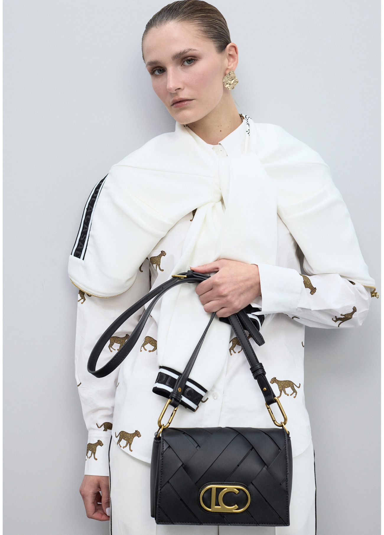Sac bandoulière tressé sophistiqué avec détail doré sur le devant. Fabriqué à partir de matériaux de haute qualité, il dispose d'une fermeture à rabat magnétique et d'une sangle ajustable. Parfait pour une utilisation de jour comme de nuit, ajoutant une touche élégante à toute tenue.