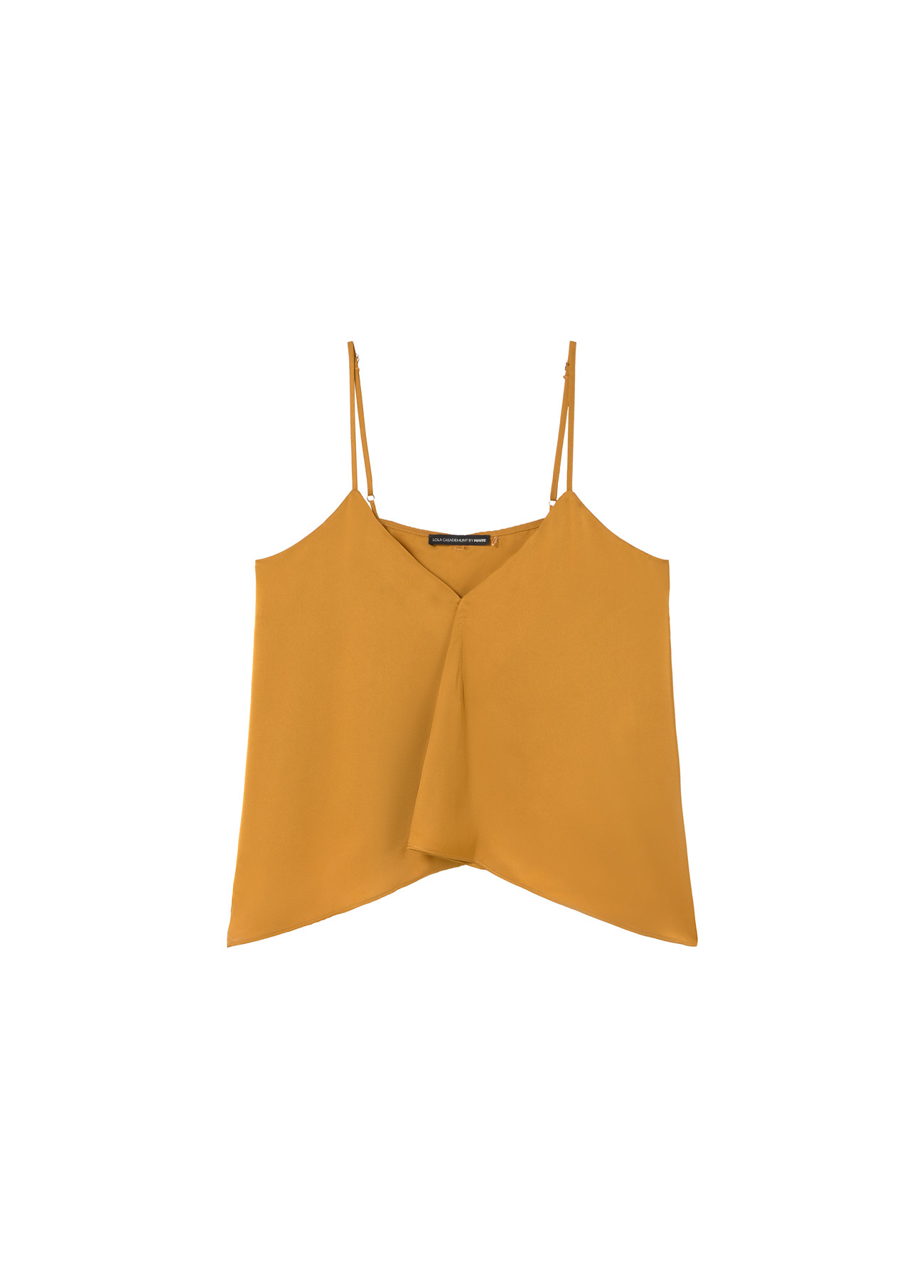 Top lingerie jaune avec fines bretelles et tissu soyeux. Doté de plis frontaux et d'un ourlet asymétrique. Parfait pour des looks frais et élégants.