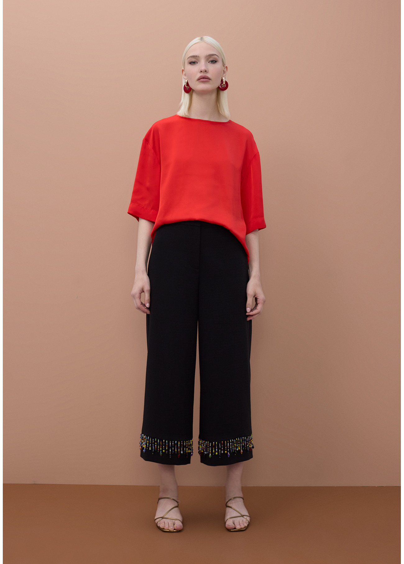 Haut à manches courtes en soie douce et brillante. Coupe ample avec col rond et fermeture à boutons au dos. Sa couleur rouge élégante et sa texture soyeuse en font le choix idéal pour des occasions spéciales. Facile à assortir pour un look sophistiqué et moderne.