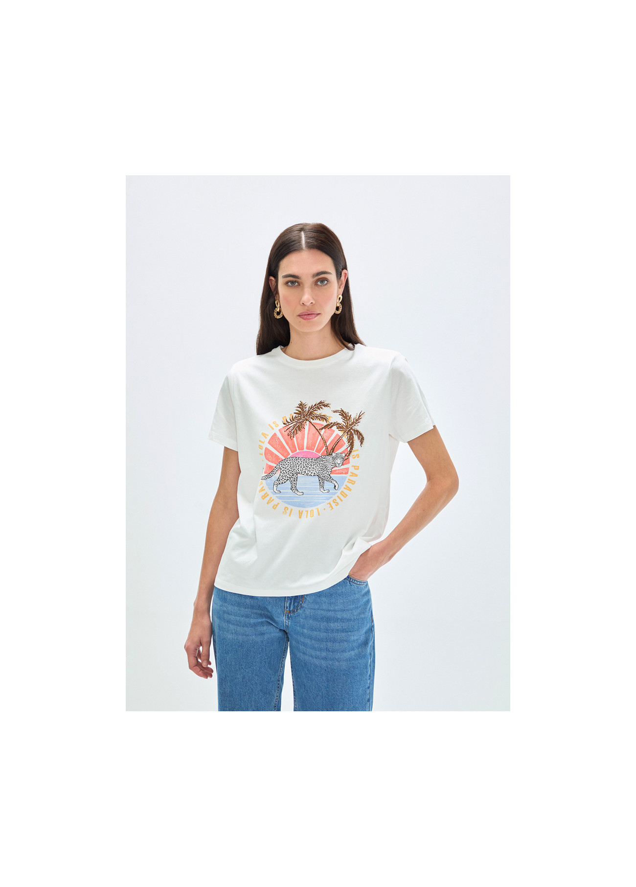 T-shirt à manches courtes avec imprimé animal et palmiers aux couleurs chaudes. Fabriqué en coton doux et respirant, parfait pour un look décontracté et confortable. Le design tropical inspire fraîcheur et style détendu.
