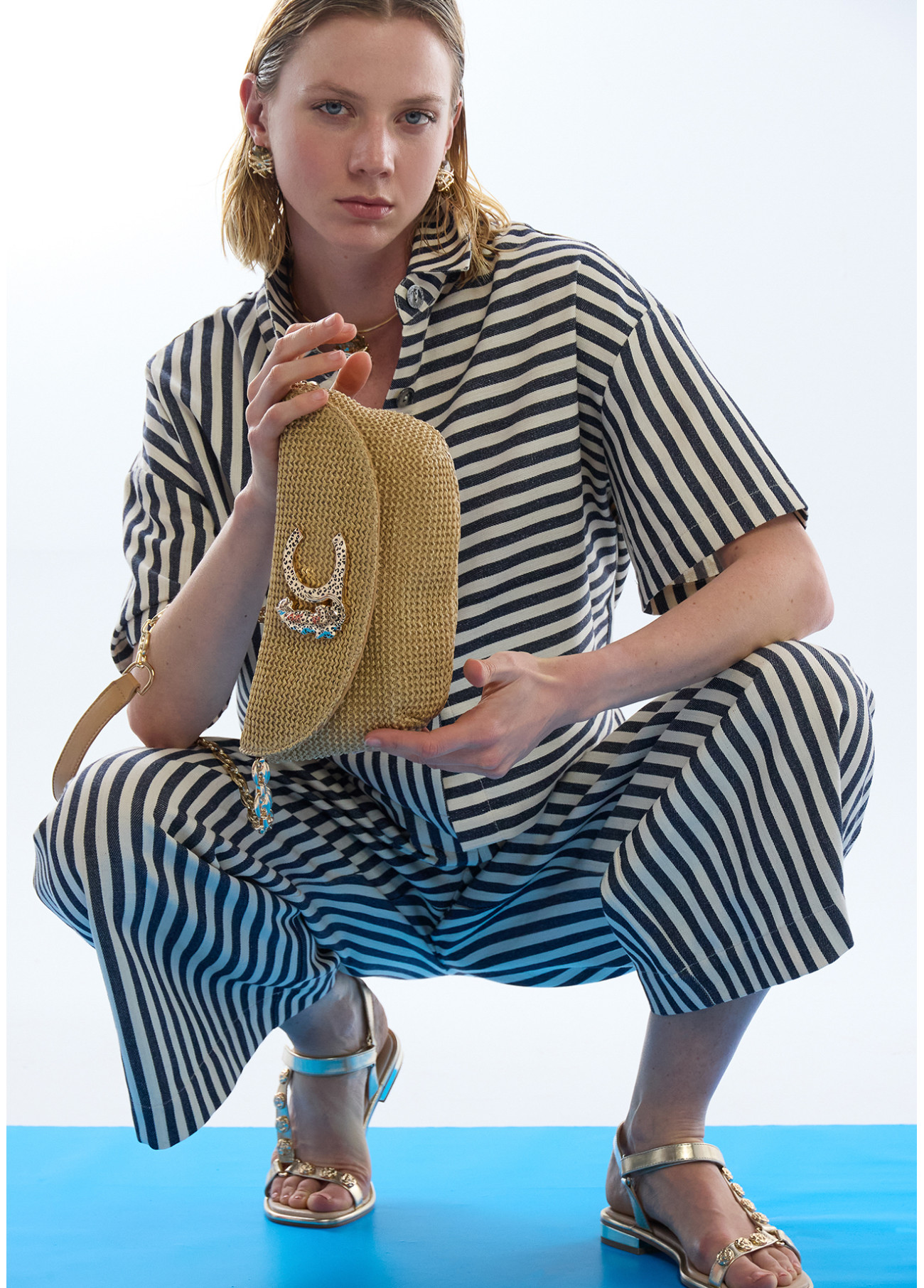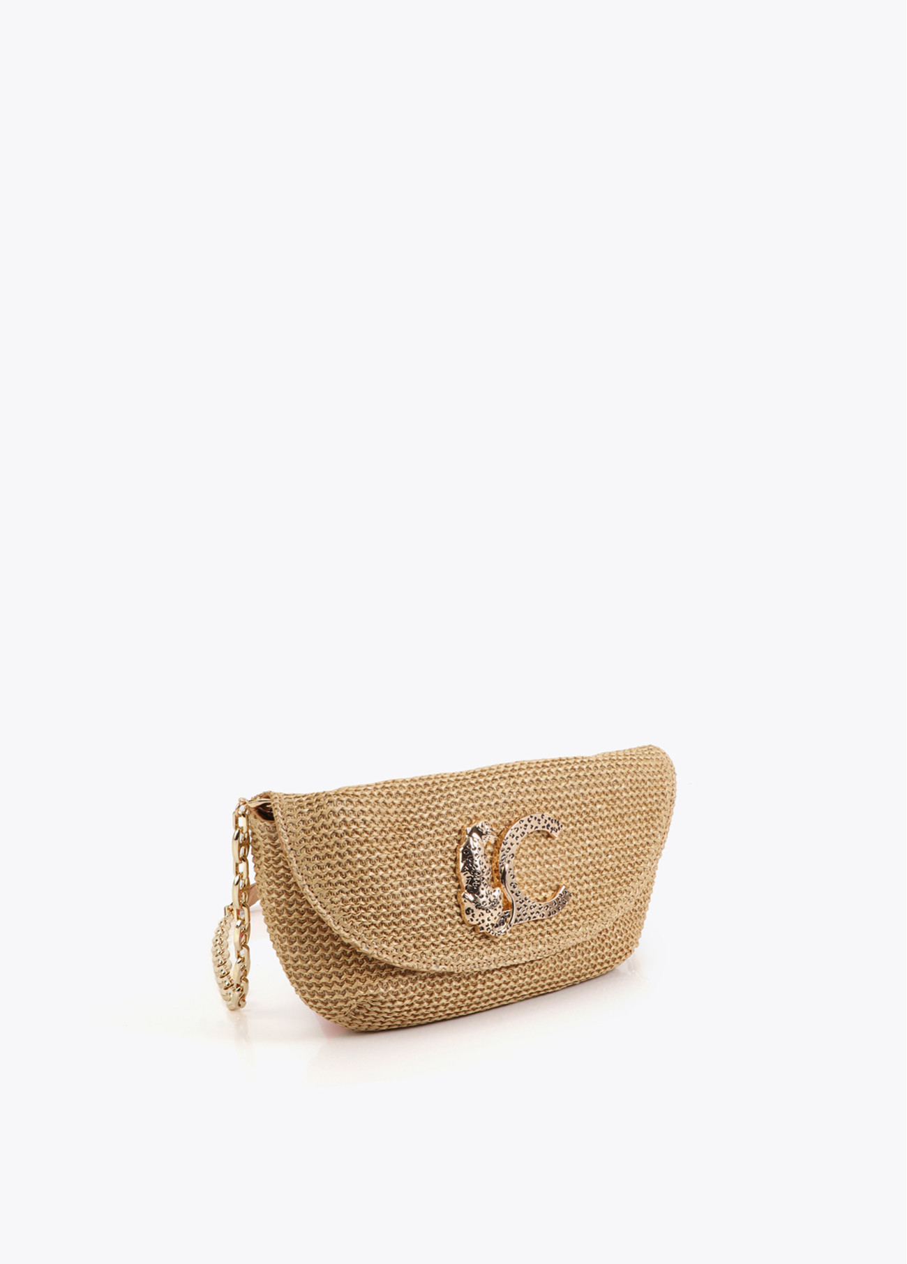 Sac en matériau effet raphia, parfait pour les événements. Détail logo léopard sur la fermeture. Anse en chaîne dorée amovible et doublure intérieure douce.