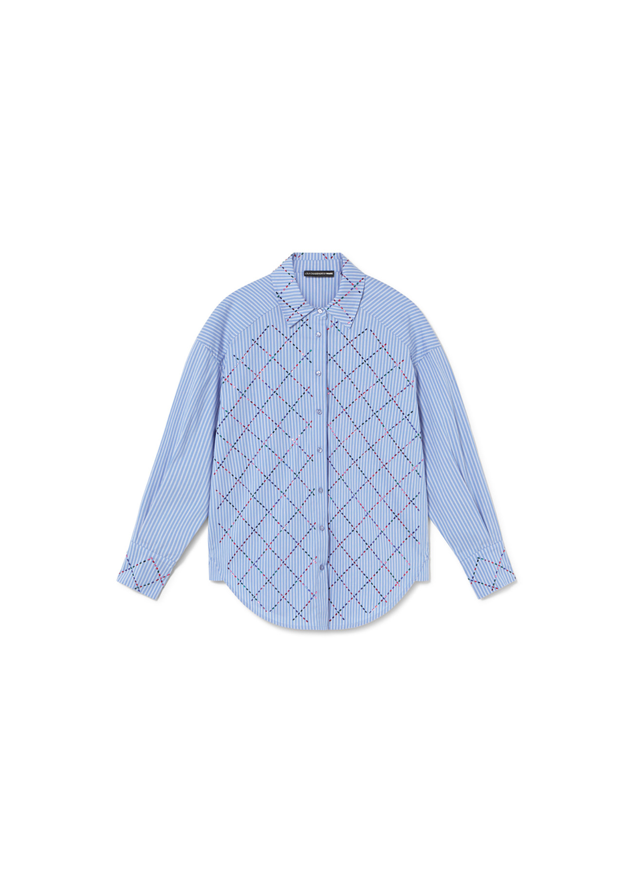 Cette chemise à rayures bleues se distingue par ses strass multicolores sur le devant. Conçue en coton de haute qualité, elle possède un col classique et des manches longues avec poignets boutonnés. Idéale pour ajouter une touche d'éclat à votre look quotidien.