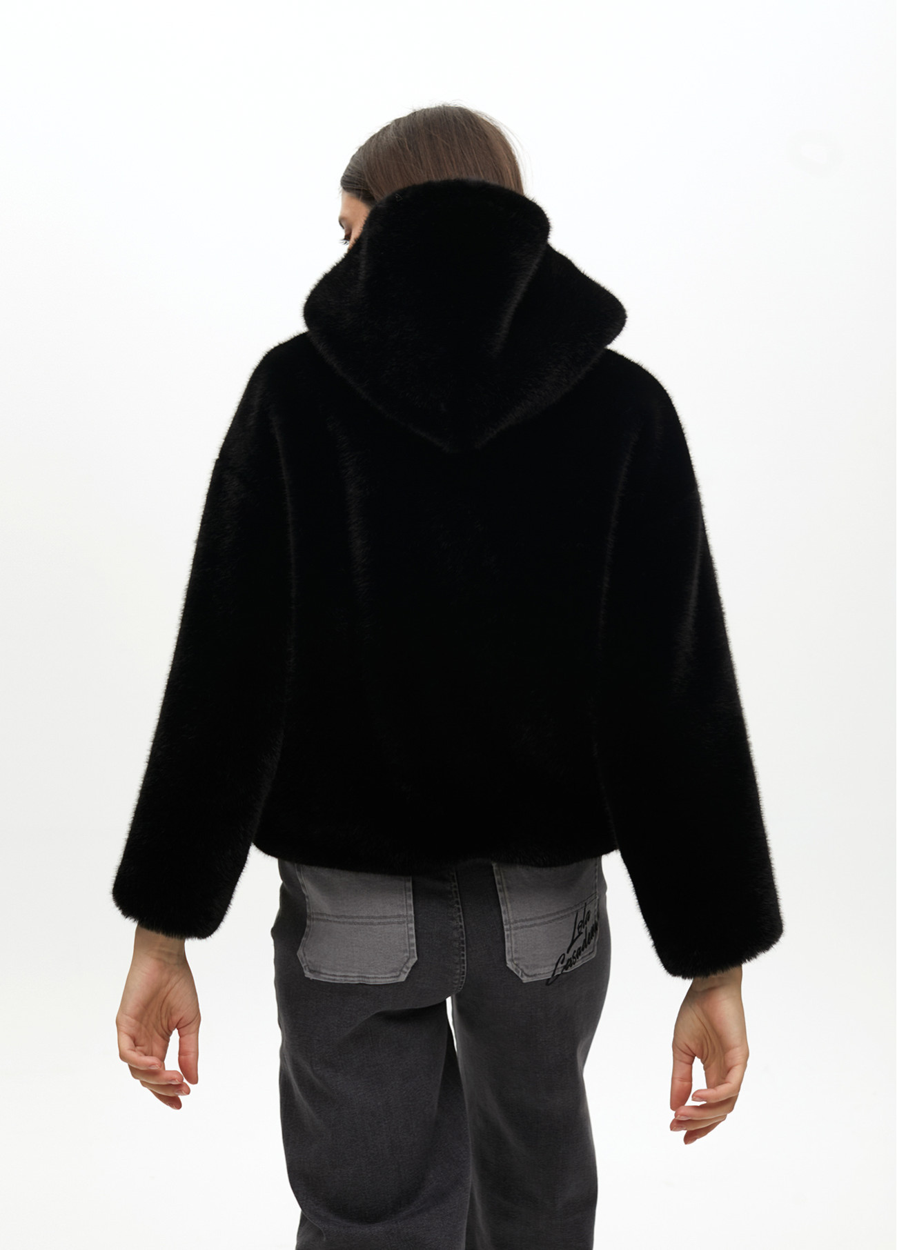 Manteau doux en fausse fourrure avec capuche ajustable. Doublure intérieure imprimé animal. Fermeture éclair frontale et manches larges. Design confortable et tendance pour l'hiver.