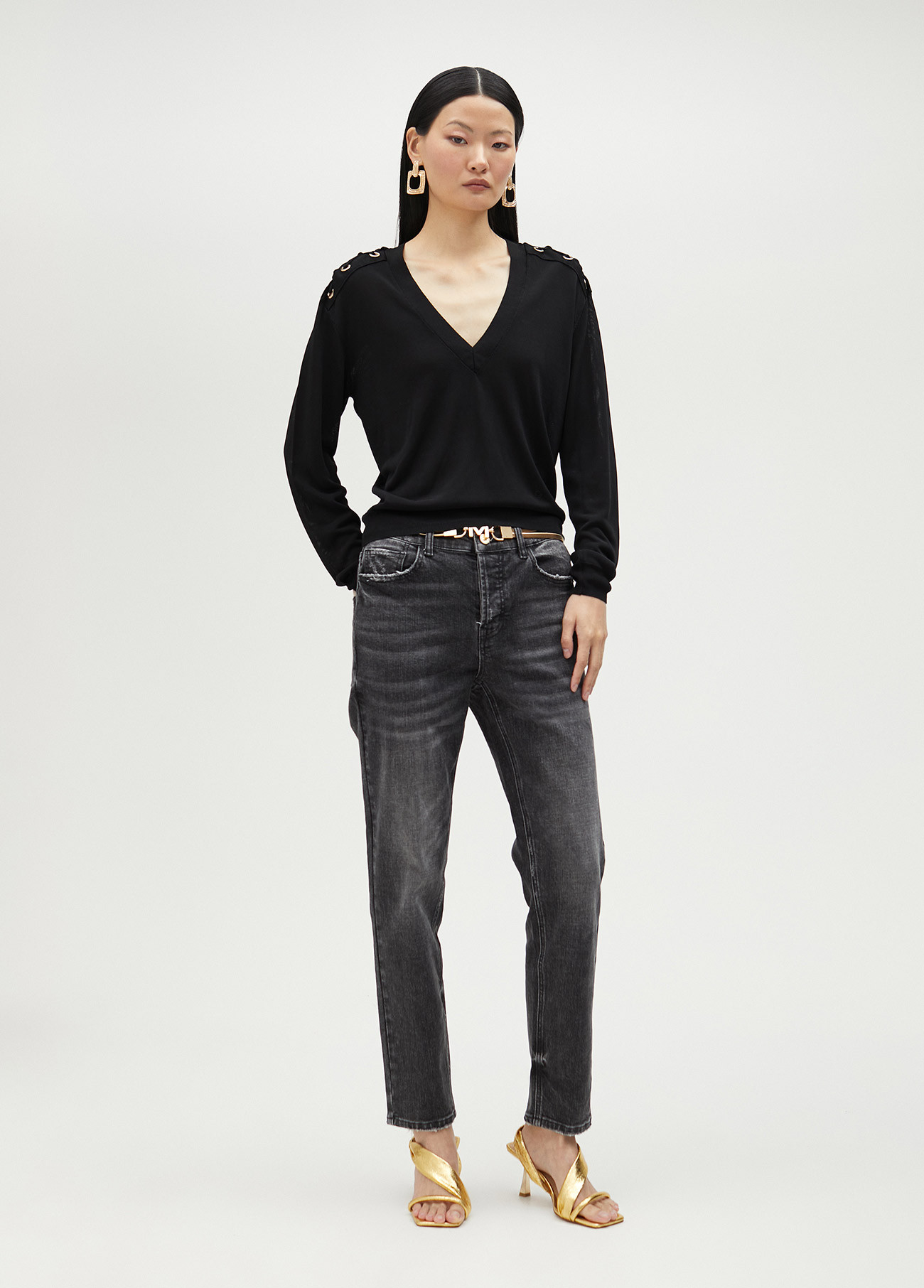 Pull en maille à col en V avec œillets et lanières croisées sur les épaules.