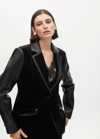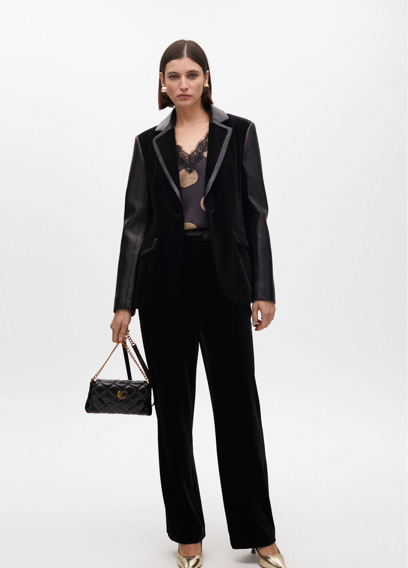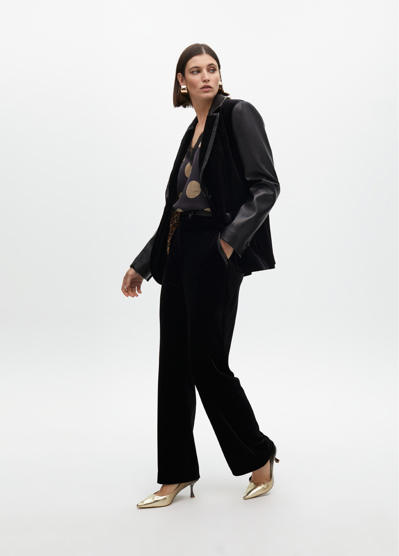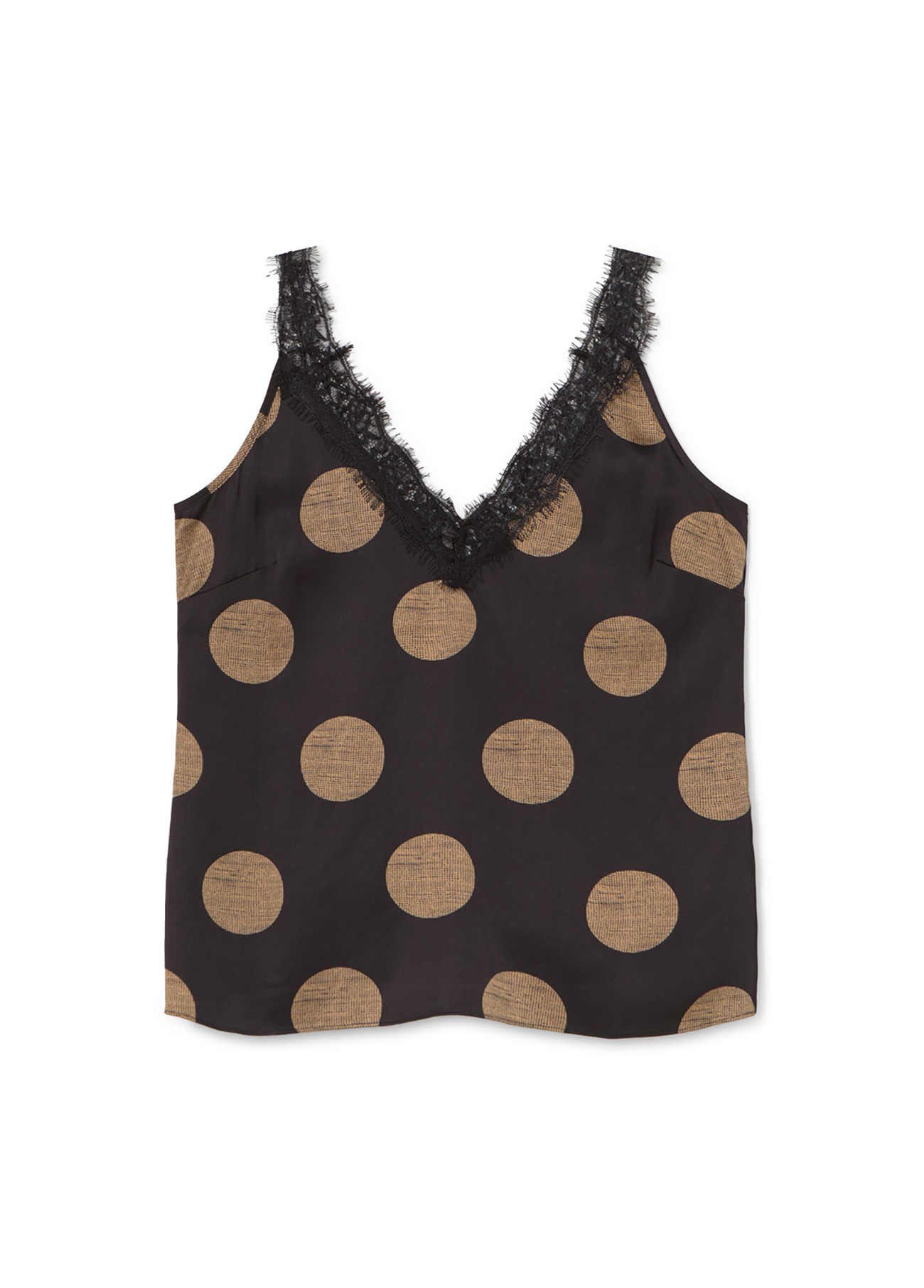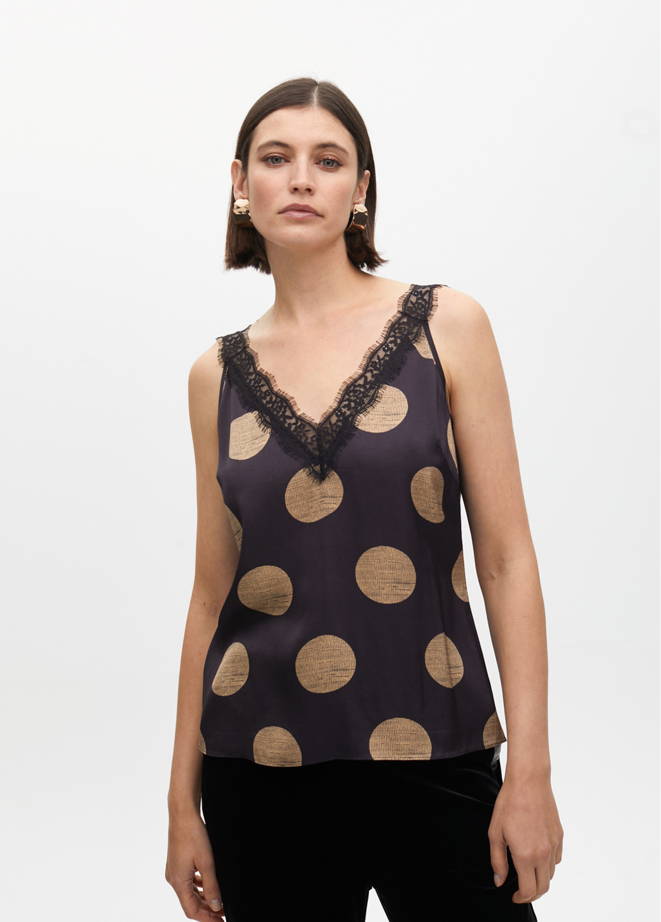 Top lingerie elegante con motivo a pois. Dettaglio in pizzo sullo scollo a V. Realizzato in tessuto morbido e leggero per uno stile sofisticato.