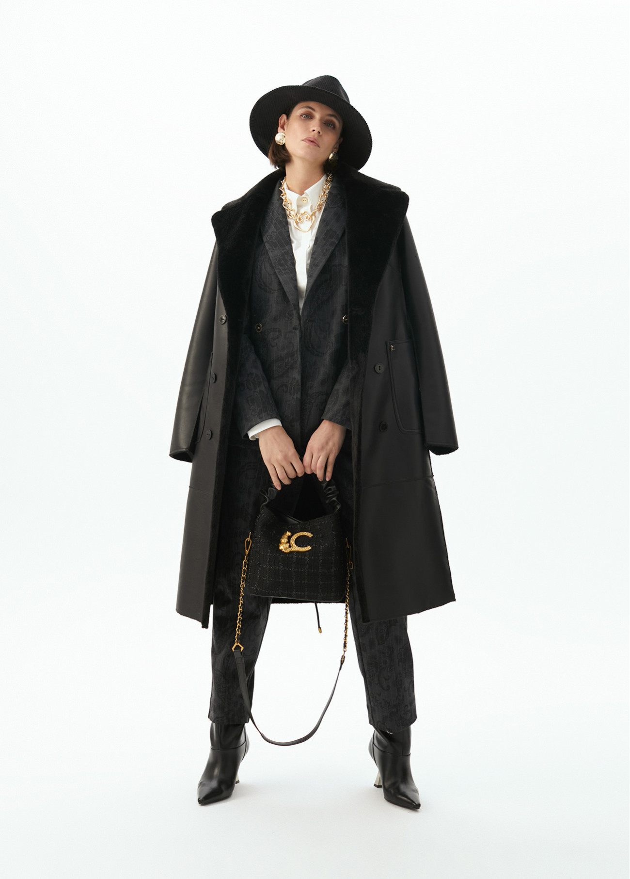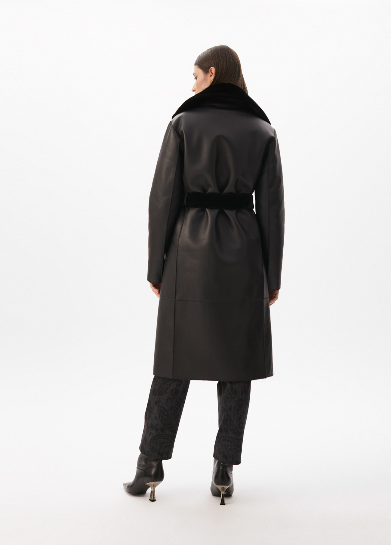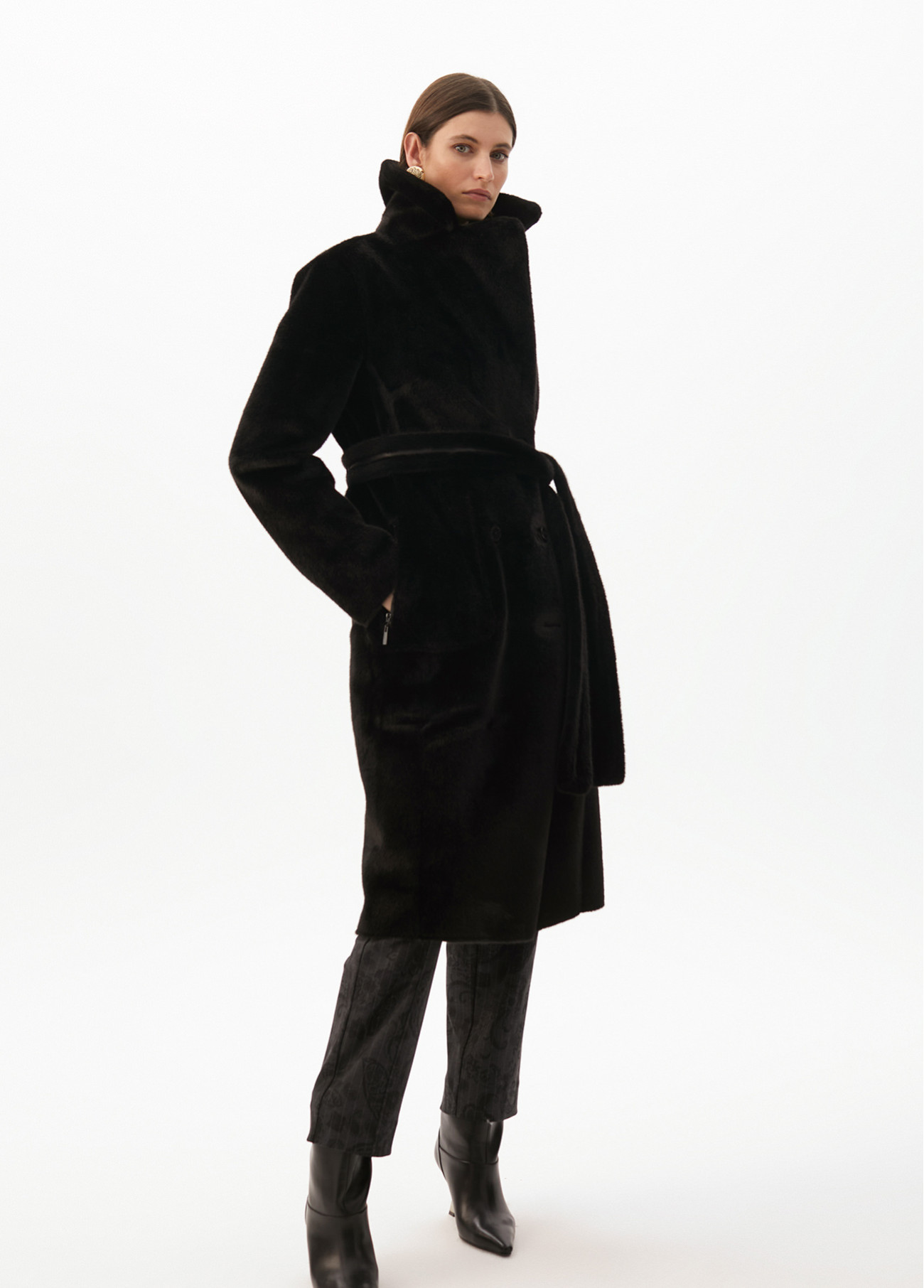 Elegante cappotto lungo nero con trama di piume. Cintura regolabile, tasche laterali e chiusura con bottoni. Perfetto per mantenersi al caldo con stile nei giorni freddi.