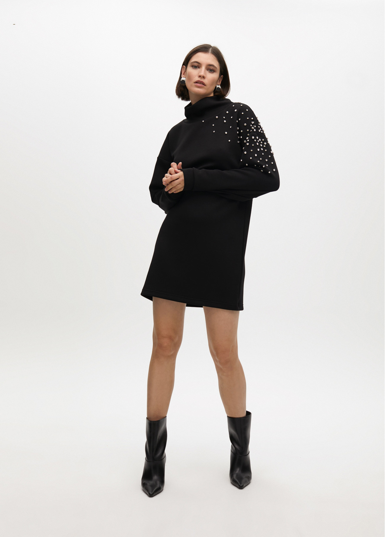 Abito nero con taglio dritto in tessuto morbido. Dettaglio gioiello sulla spalla e sulla manica. Collo alto e maniche lunghe con polsini aderenti. Perfetto per qualsiasi occasione.