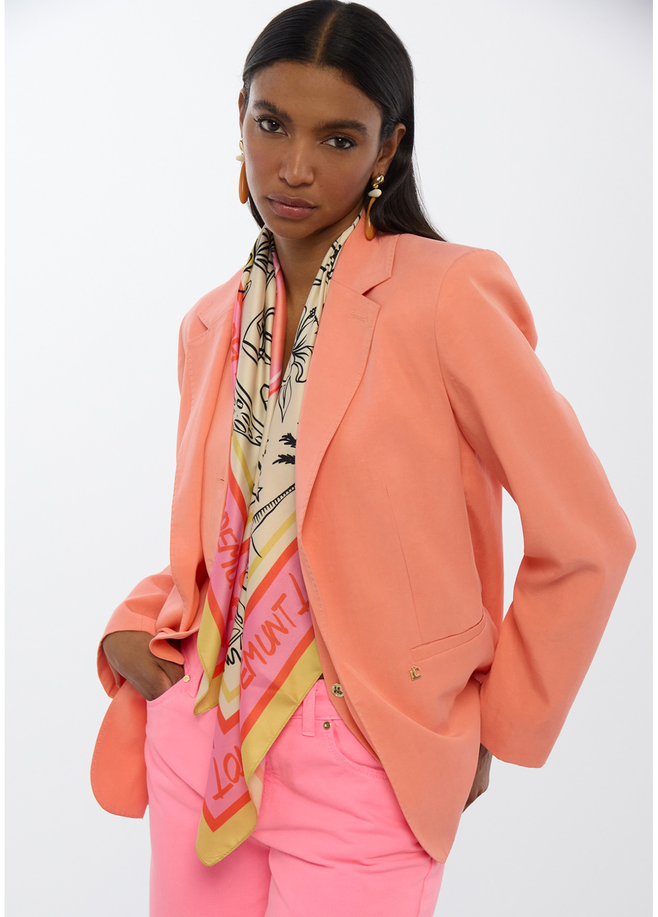 Blazer a vestibilità regolare in vibrante tonalità corallo. Design senza bottoni con revers classici e tasche laterali. Perfetto per un look moderno ed elegante.