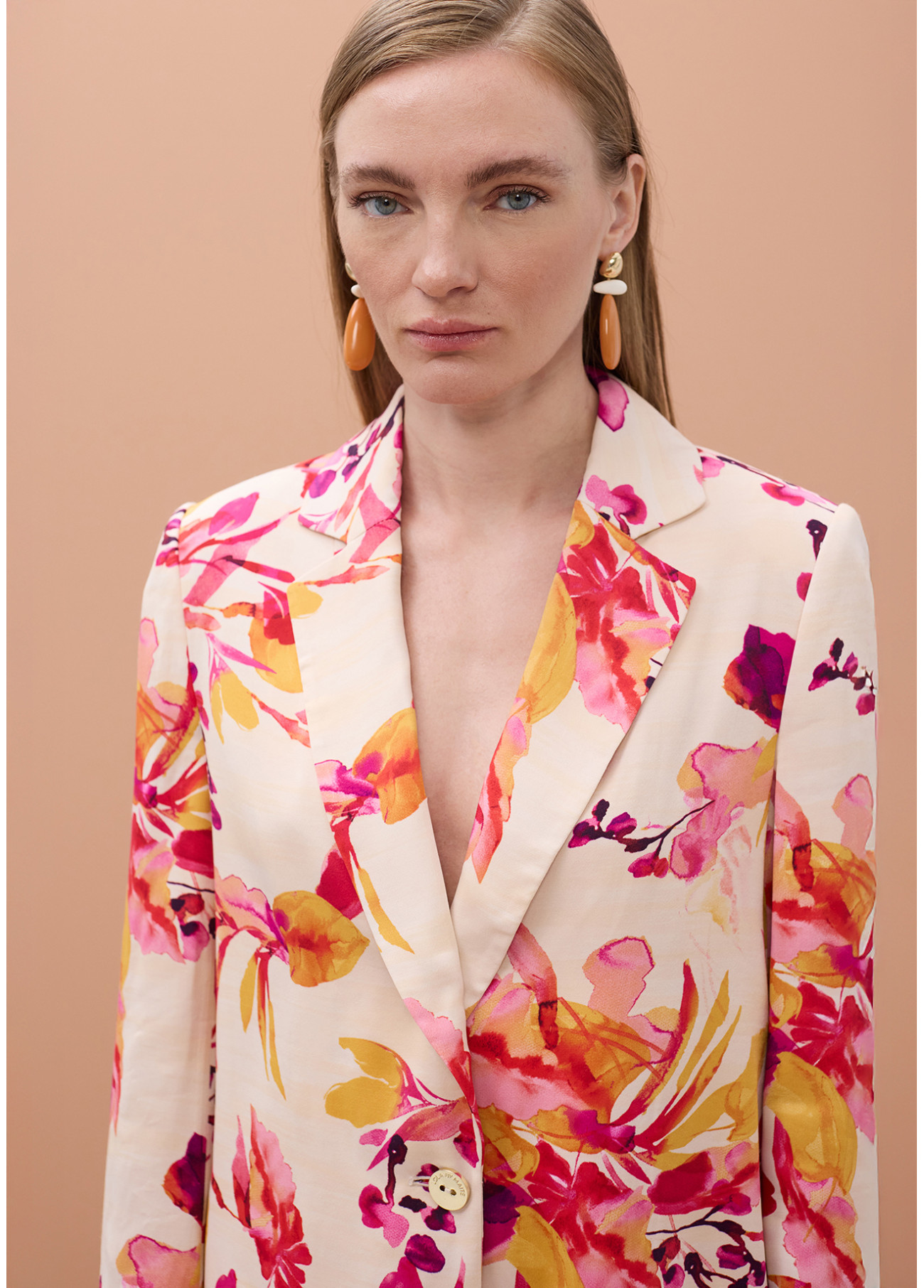 Elegante blazer fluido con taglio dritto e una vivace stampa floreale. Realizzato in tessuto leggero per una vestibilità comoda e sofisticata. Perfetto per occasioni speciali. Disponibile in più taglie.