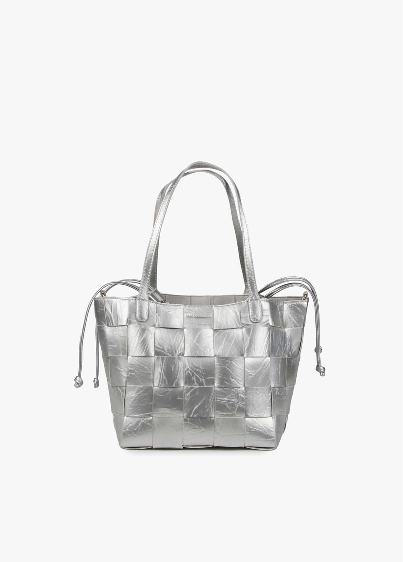 Borsa shopper intrecciata effetto pelle con texture e sacchetto interno. Include tracolla e piccolo scomparto interno. Chiusura con coulisse regolabile.