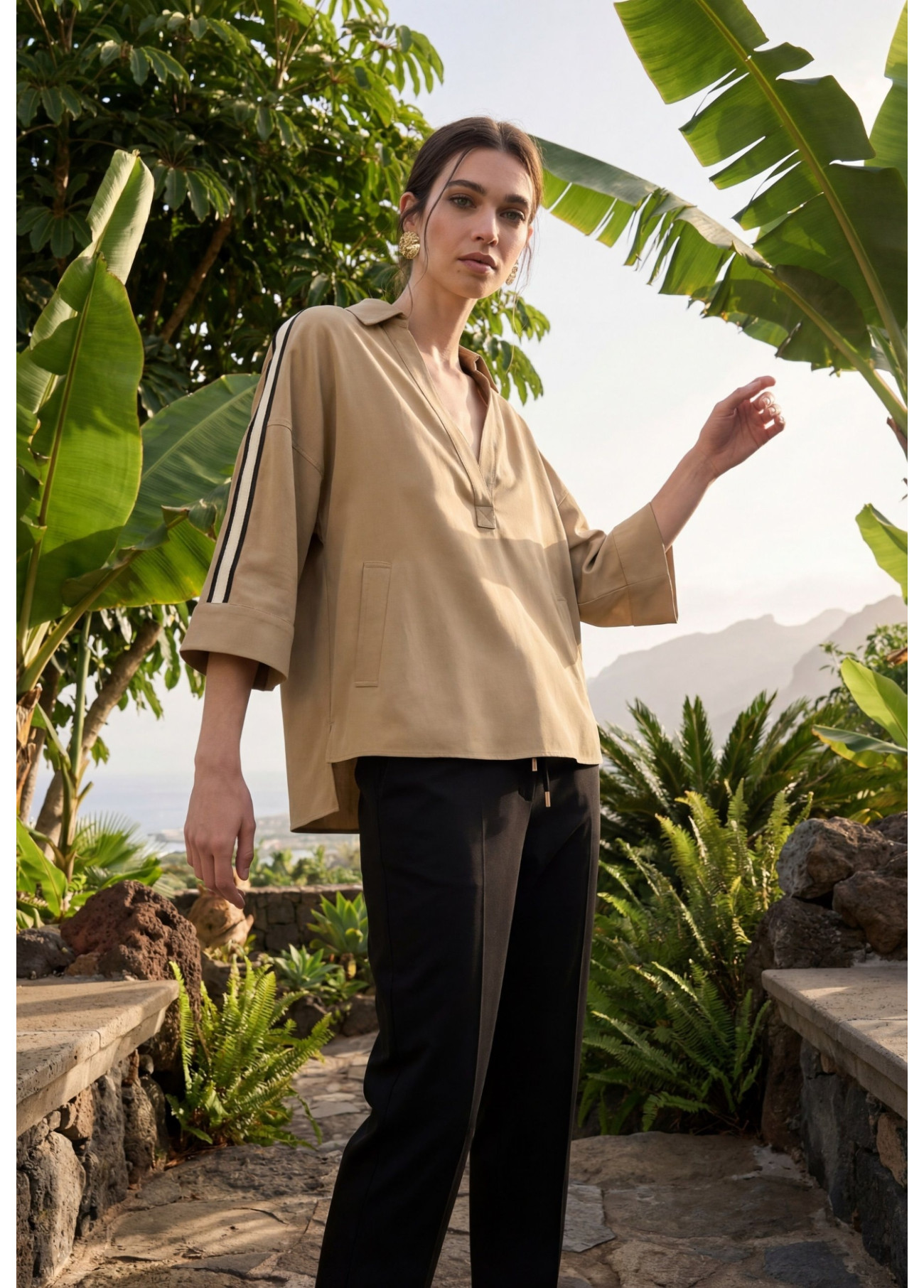 Elegante camicia beige con scollo a V aperto. Maniche 3/4 con dettaglio a righe in contrasto. Design ampio e fluido, ideale per un look casual e sofisticato.