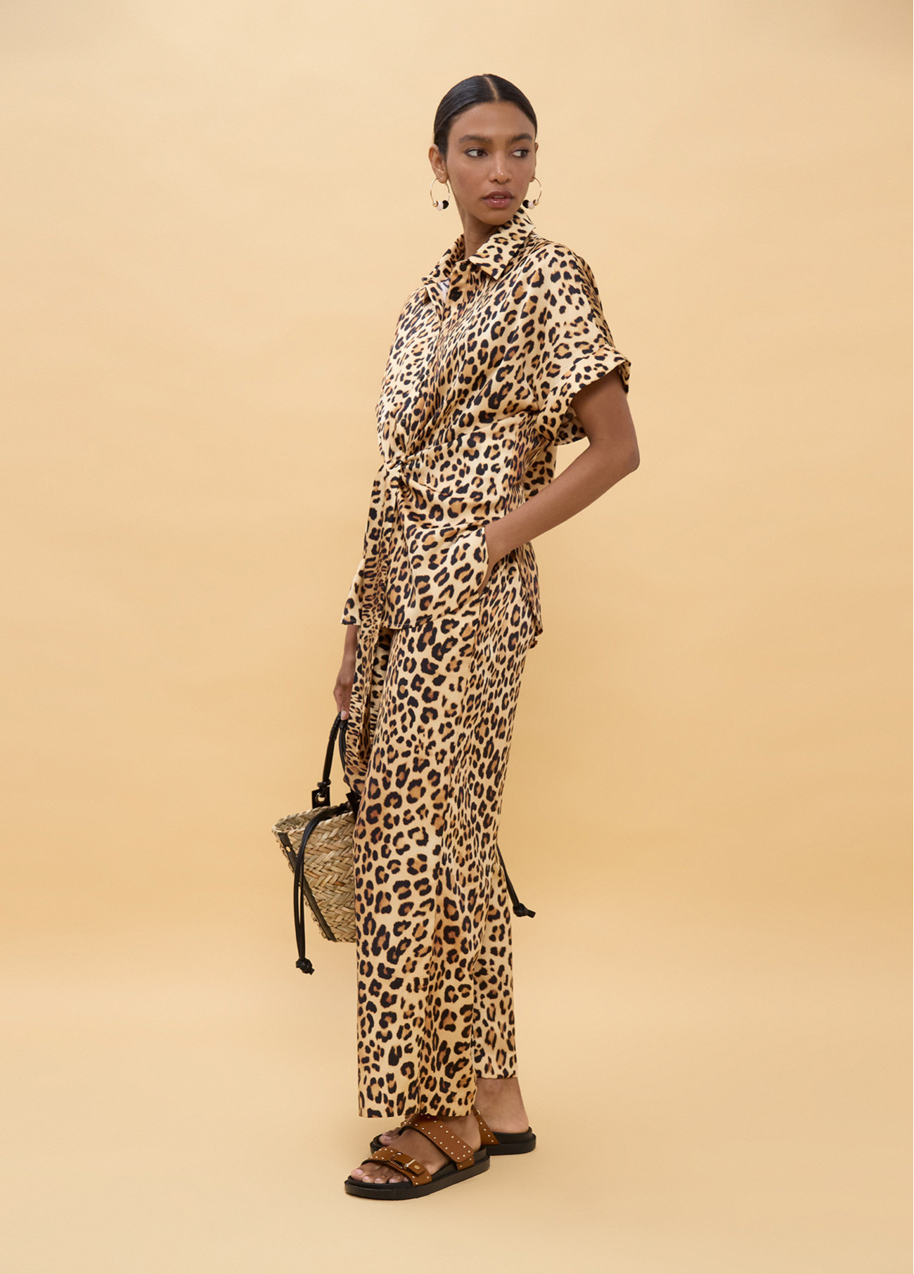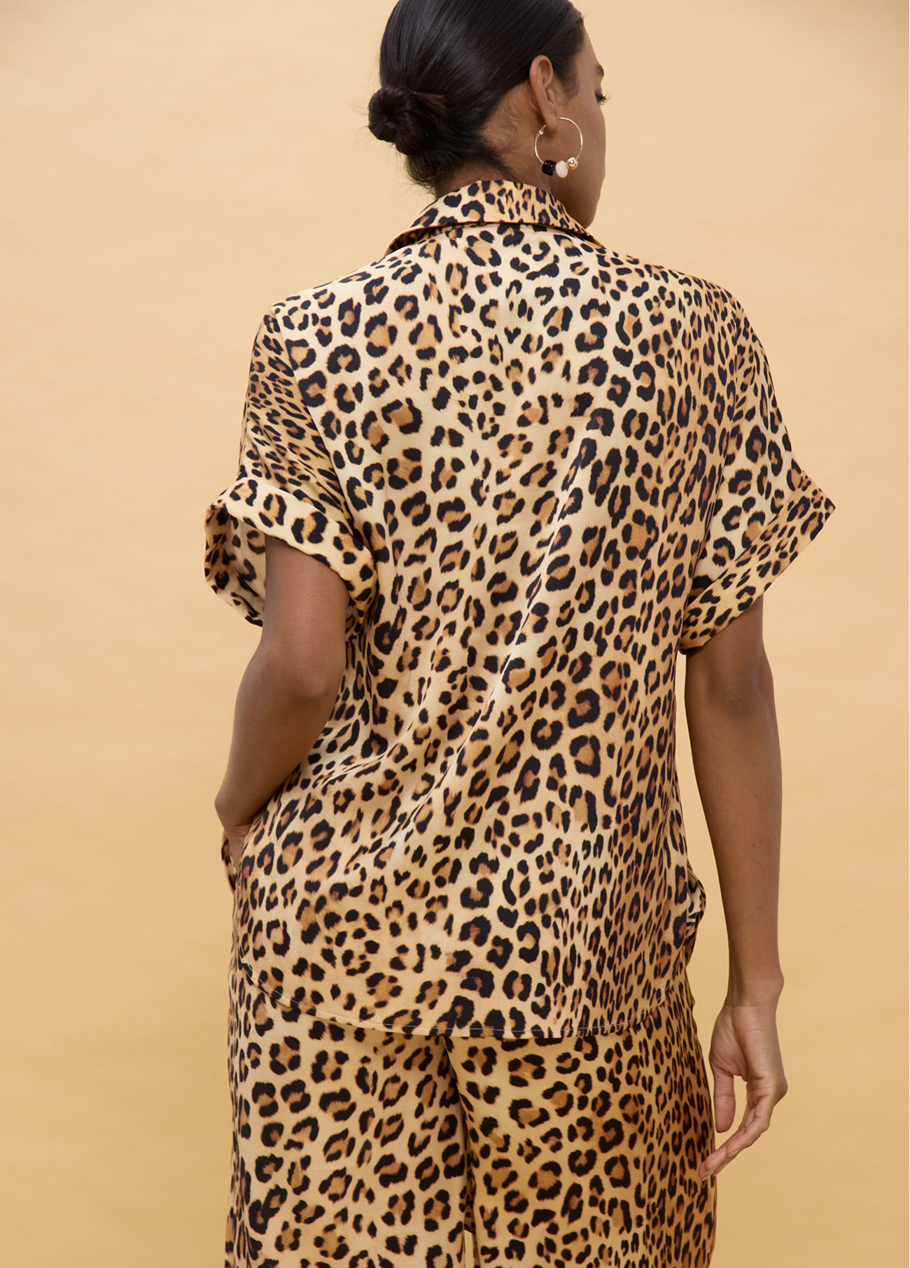 Camicia a maniche corte con design nodo frontale e stampa animalier. In tessuto morbido ideale per l'estate. Perfetta per un look casual e moderno.