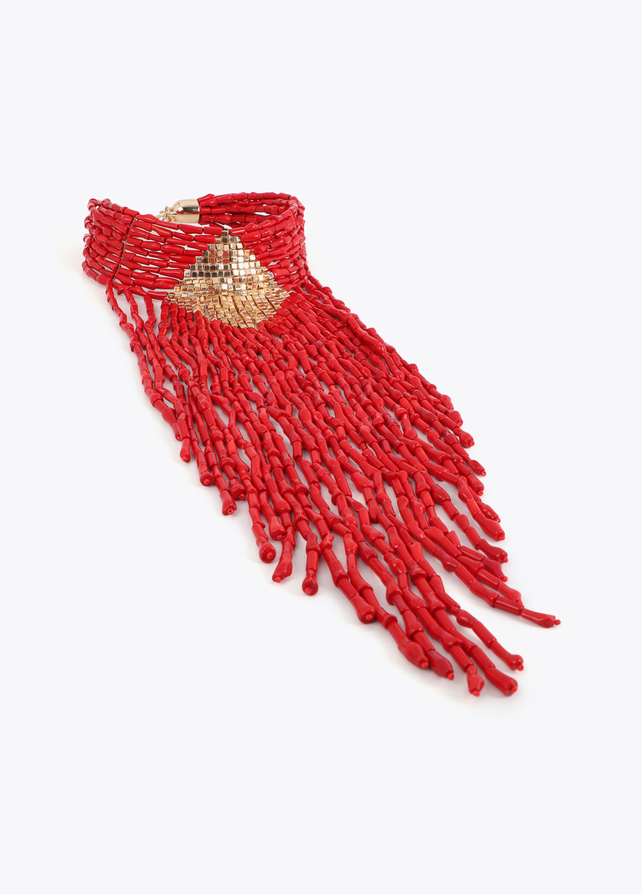Splendida collana a cascata con perline corallo e dettagli dorati. Combina eleganza e stile con un design audace. Chiusura regolabile sul retro, perfetta per valorizzare ogni look serale.