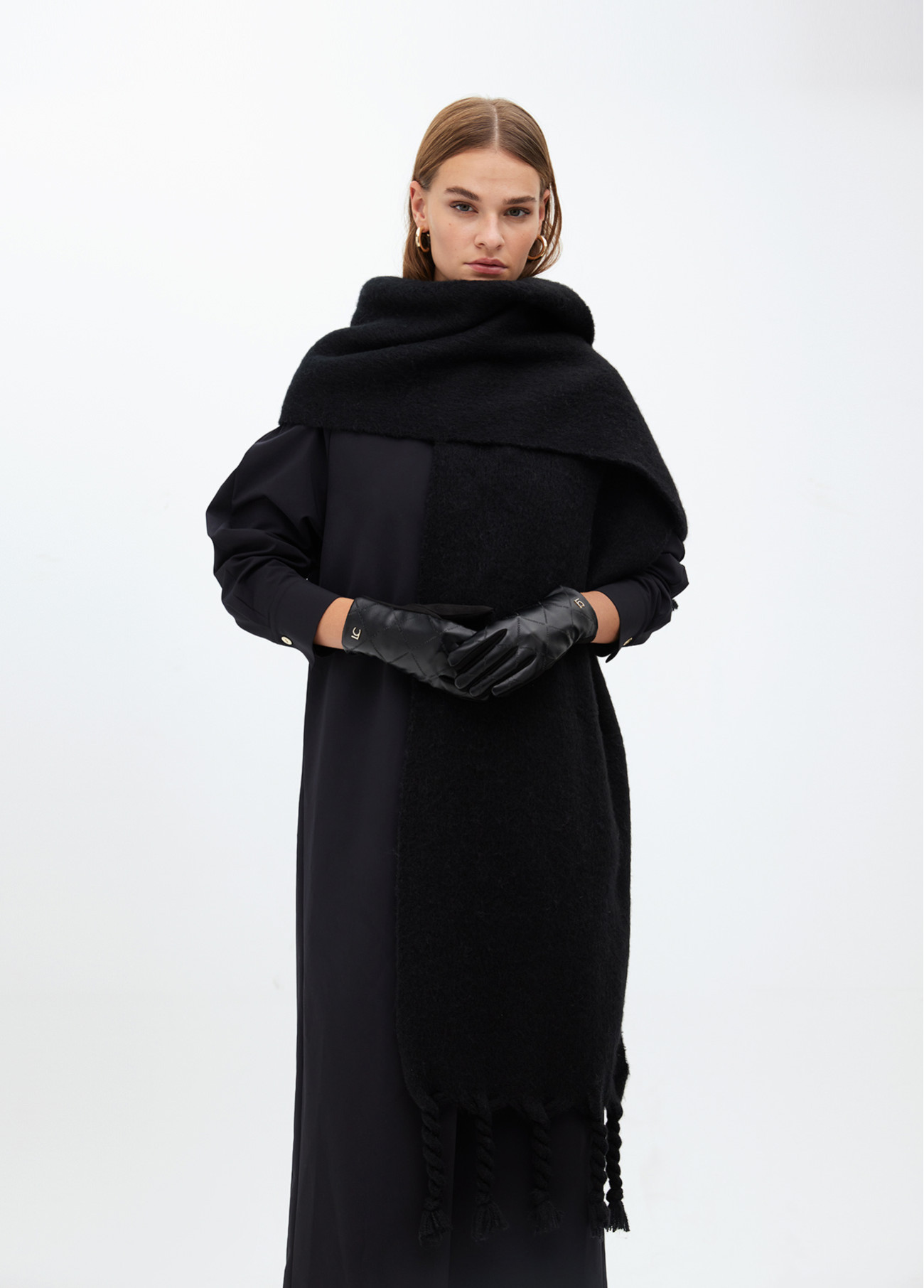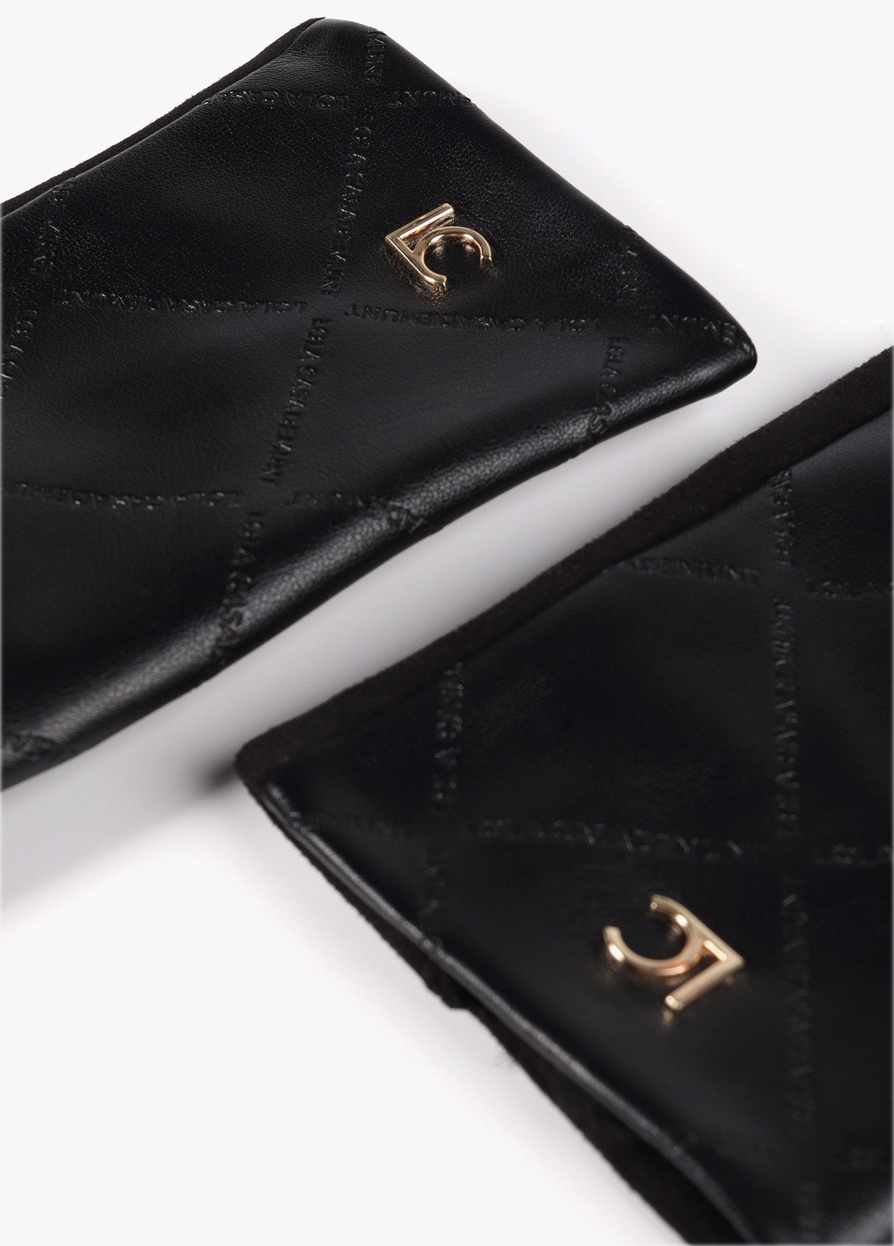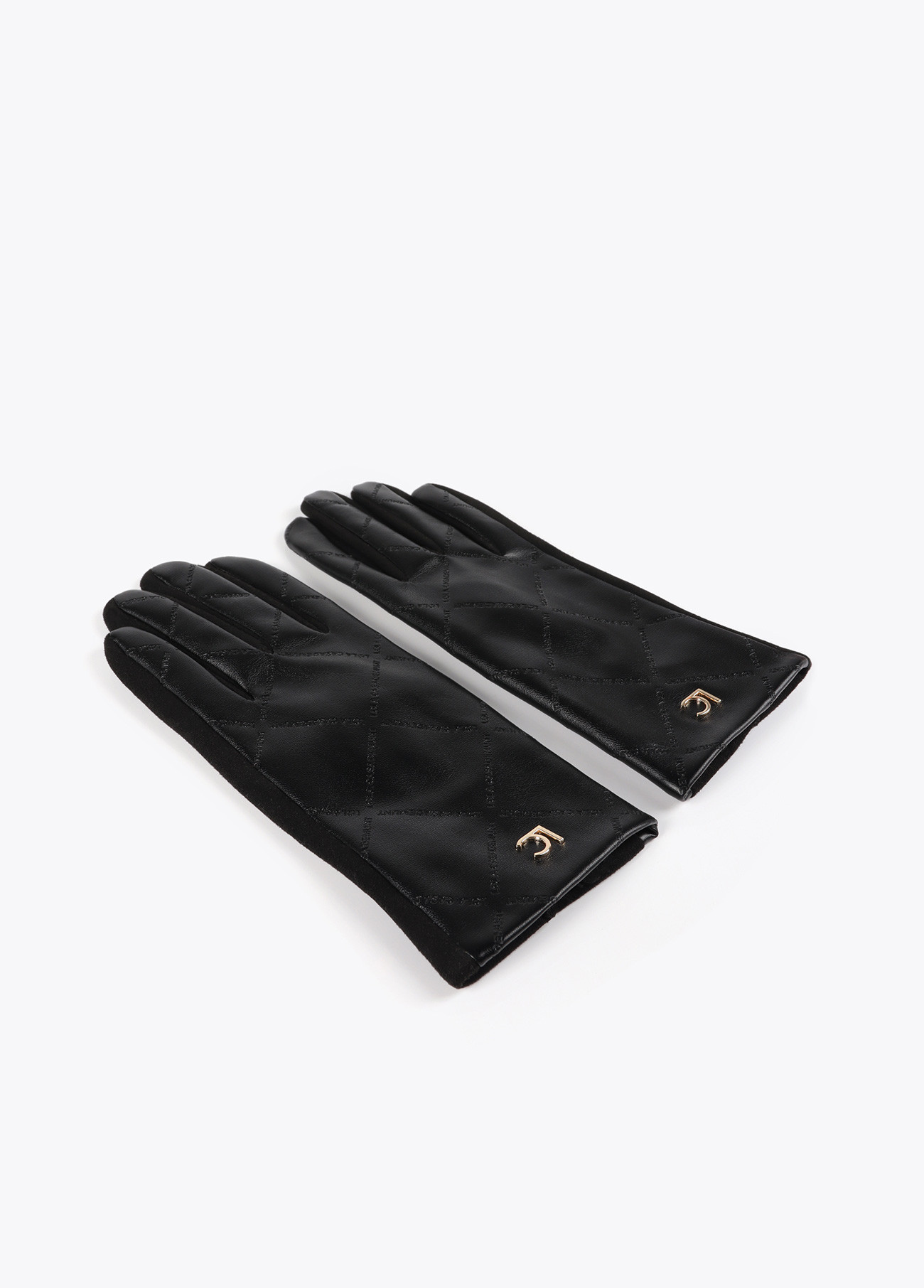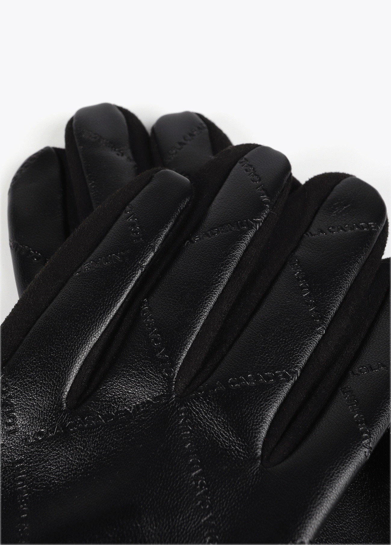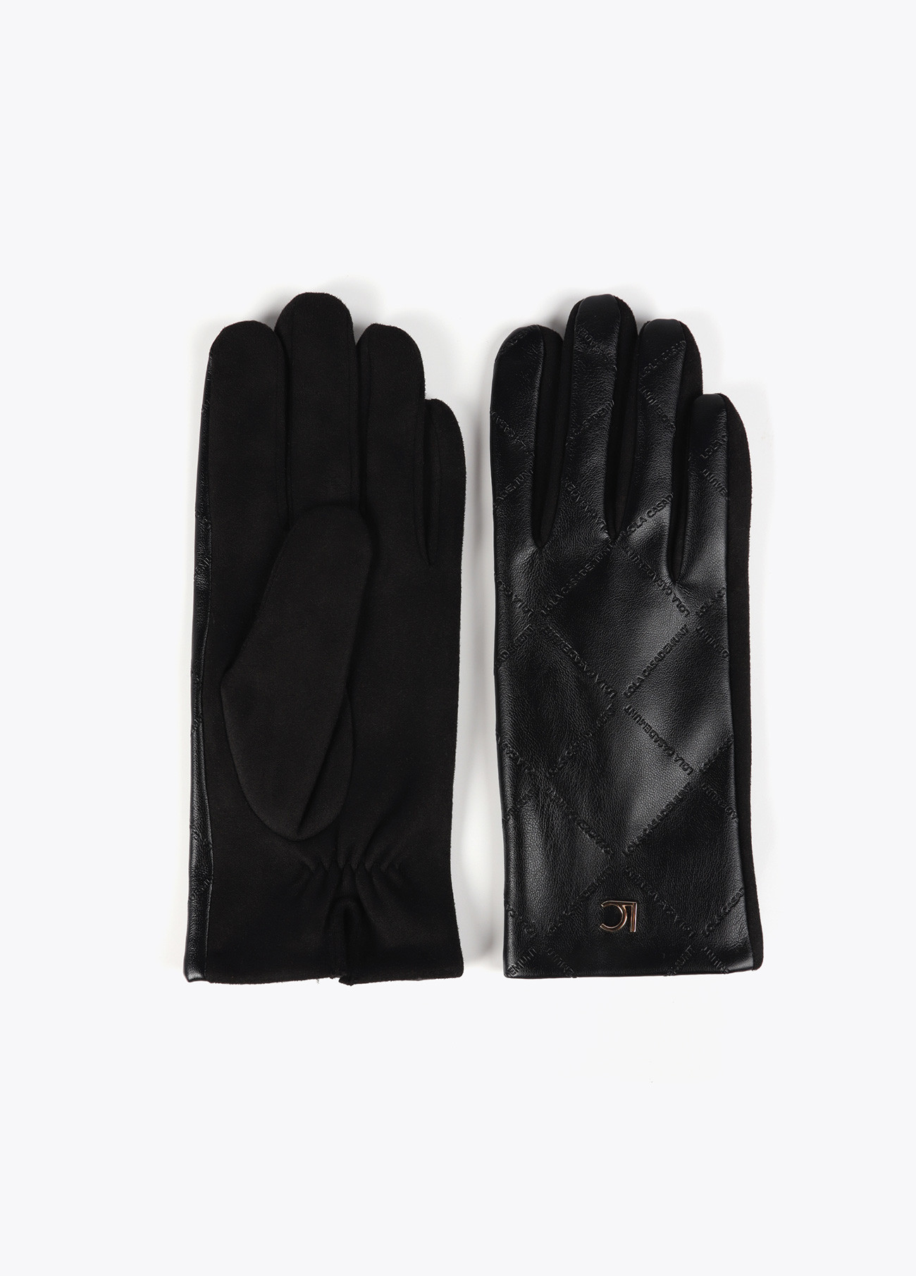 Guanti eleganti in pelle con logo a reticolo. Fodera morbida al tatto e logo metallico sul polsino. Design moderno e confortevole, ideale per il tuo look invernale.