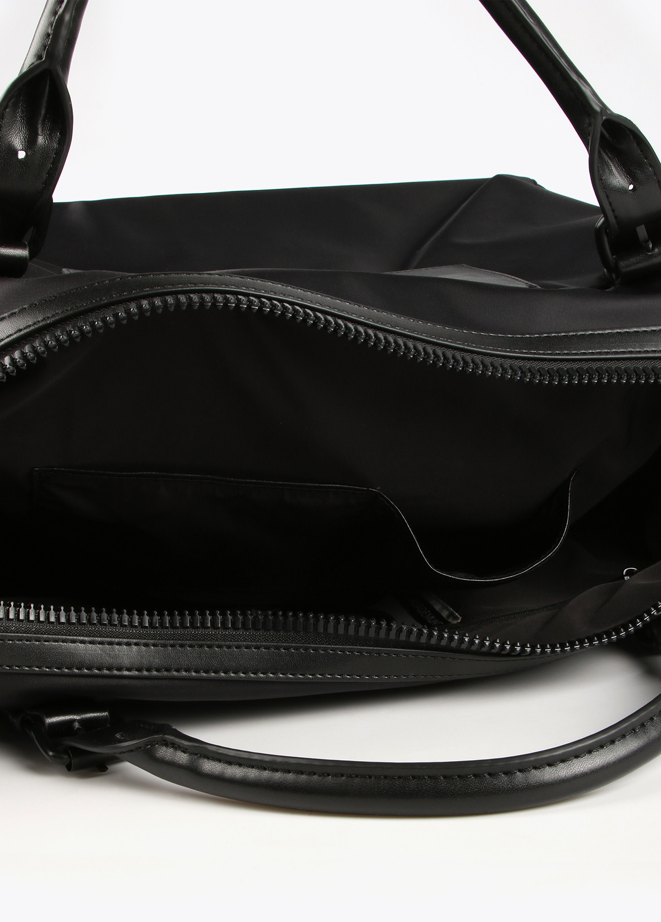 Borsa weekend nera in nylon con effetto pelle. Dotata di tasca anteriore con logo, manici e tracolla logata. Chiusura a cerniera con pratici scomparti interni. Misure: 22.5cm x 19.5cm x 45cm.