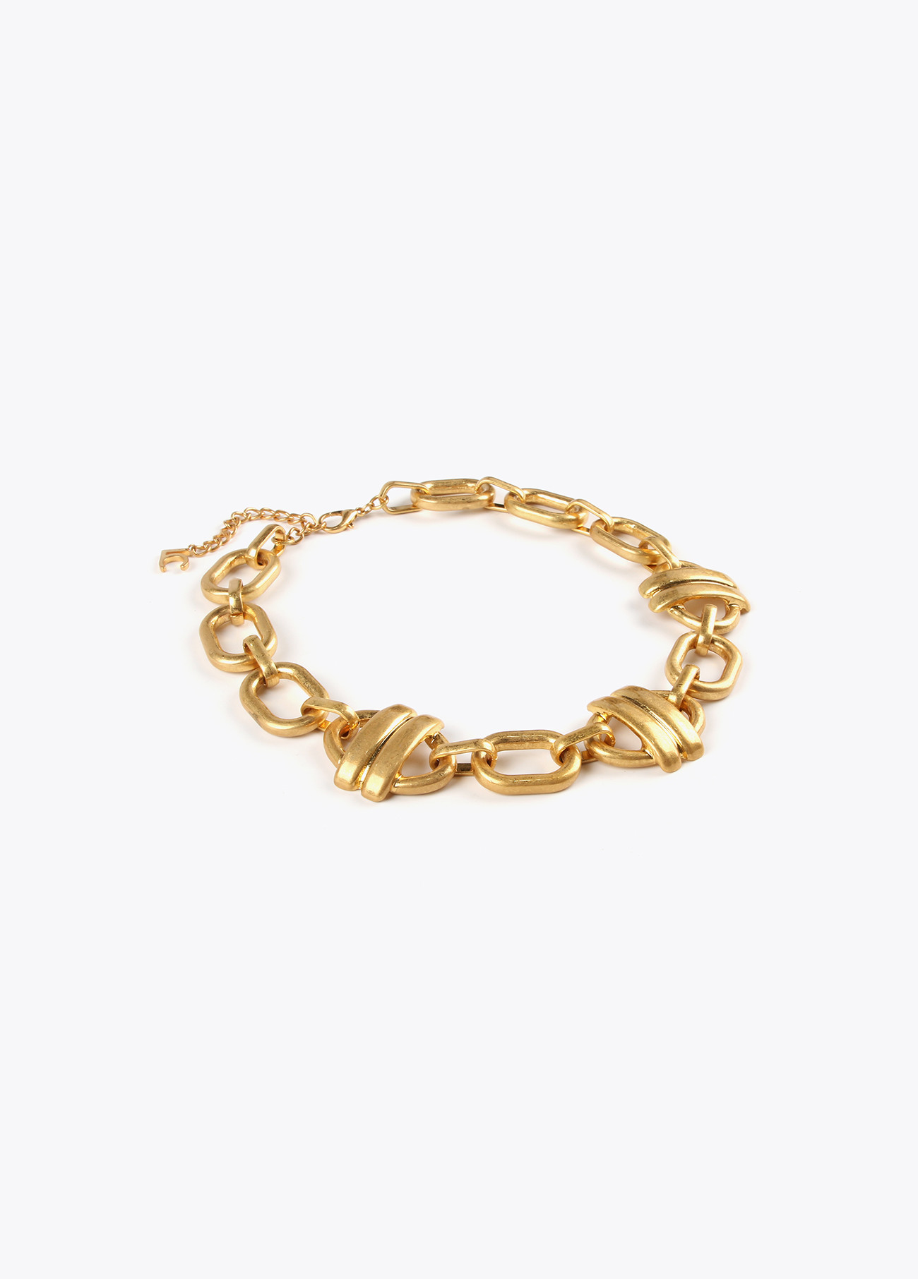 Collana girocollo dorata con anelli a catenella e anelli barrati combinati. Chiusura regolabile.