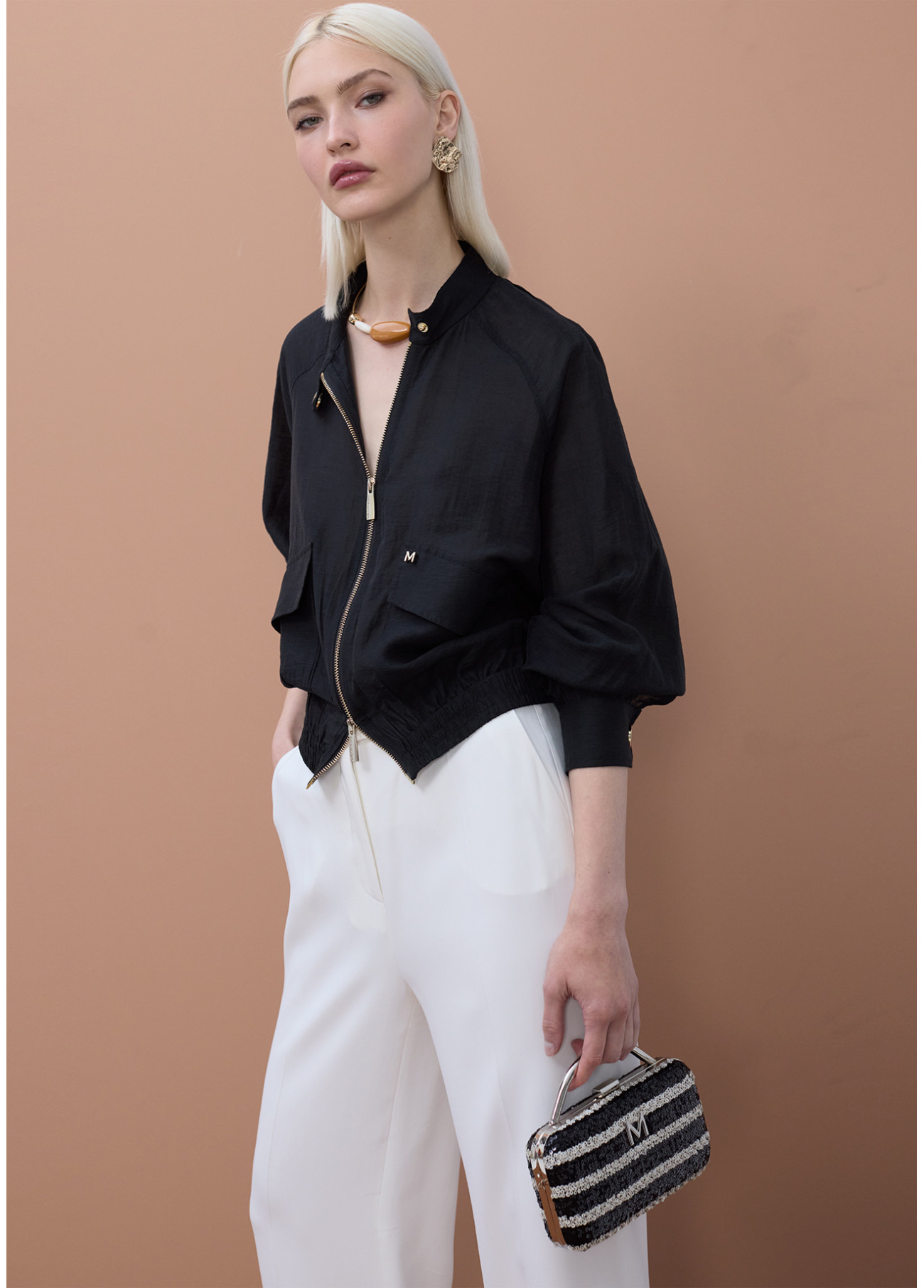 Giacca bomber con maniche raglan e tasche frontali comode. Realizzata in tessuto leggero ideale per la mezza stagione. Chiusura con zip dorata e polsini elasticizzati per maggiore comfort. Perfetta per uno stile urbano e sofisticato.