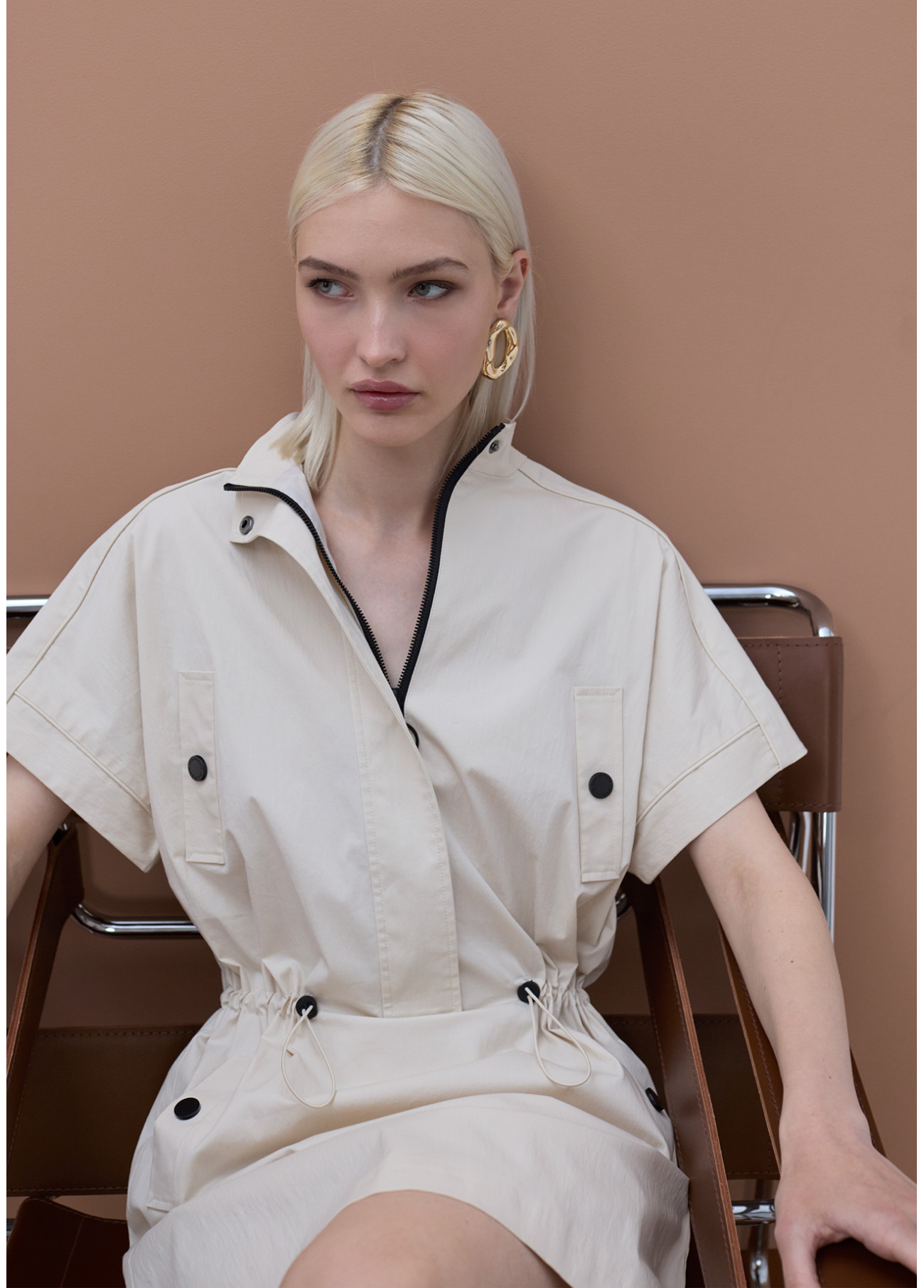 Abito dritto in stile anni '80 con collo alto e maniche corte. Realizzato in tessuto leggero, con tasche frontali e cintura regolabile. Perfetto per un look casual chic, comodo e versatile.