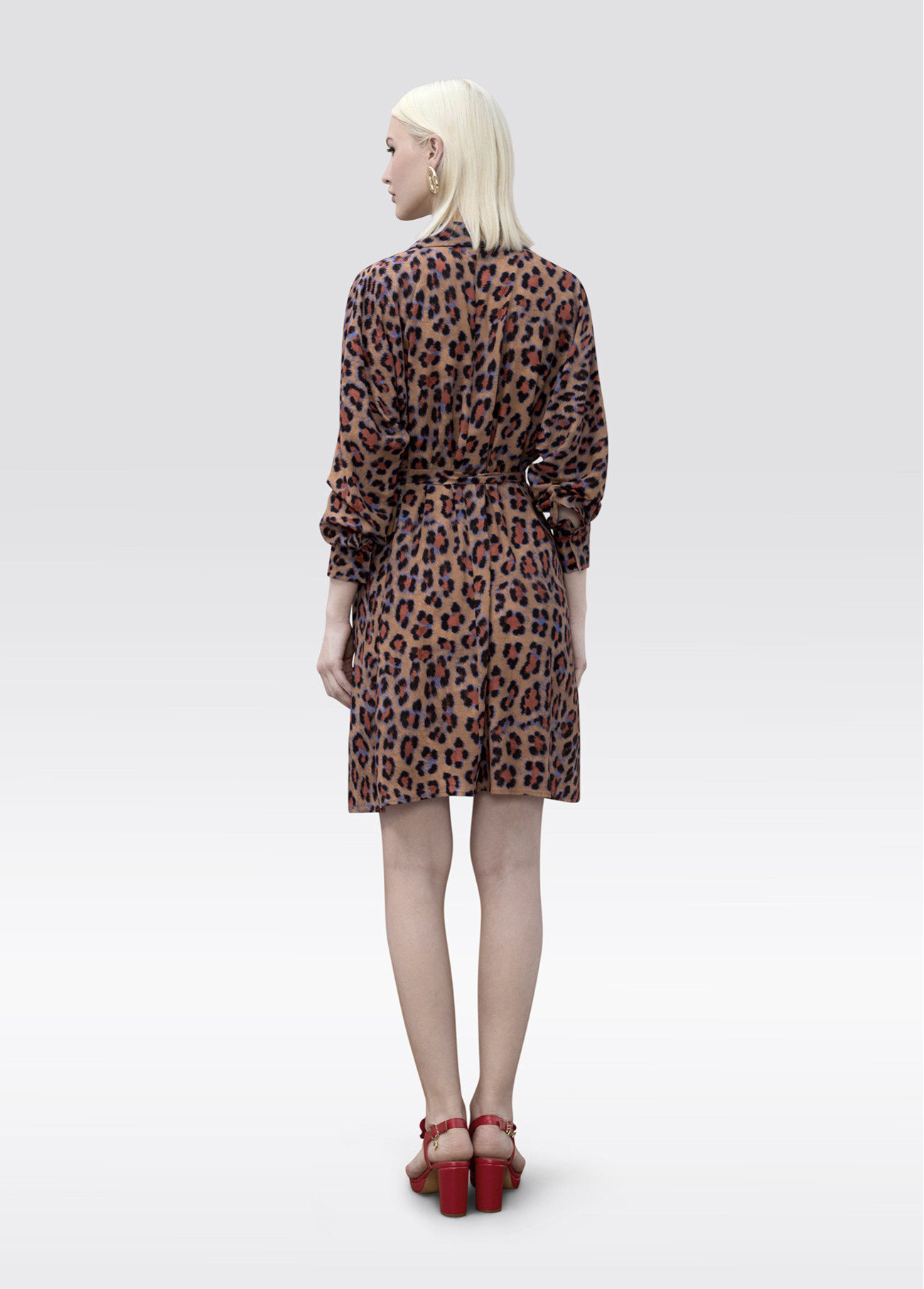 Vestito camicia corto con stampa animale. Maniche lunghe e cintura regolabile per definire la silhouette. Realizzato in tessuto leggero per un drappeggio fluido. Ideale per abbinare accessori vistosi e aggiungere un tocco audace al tuo look.