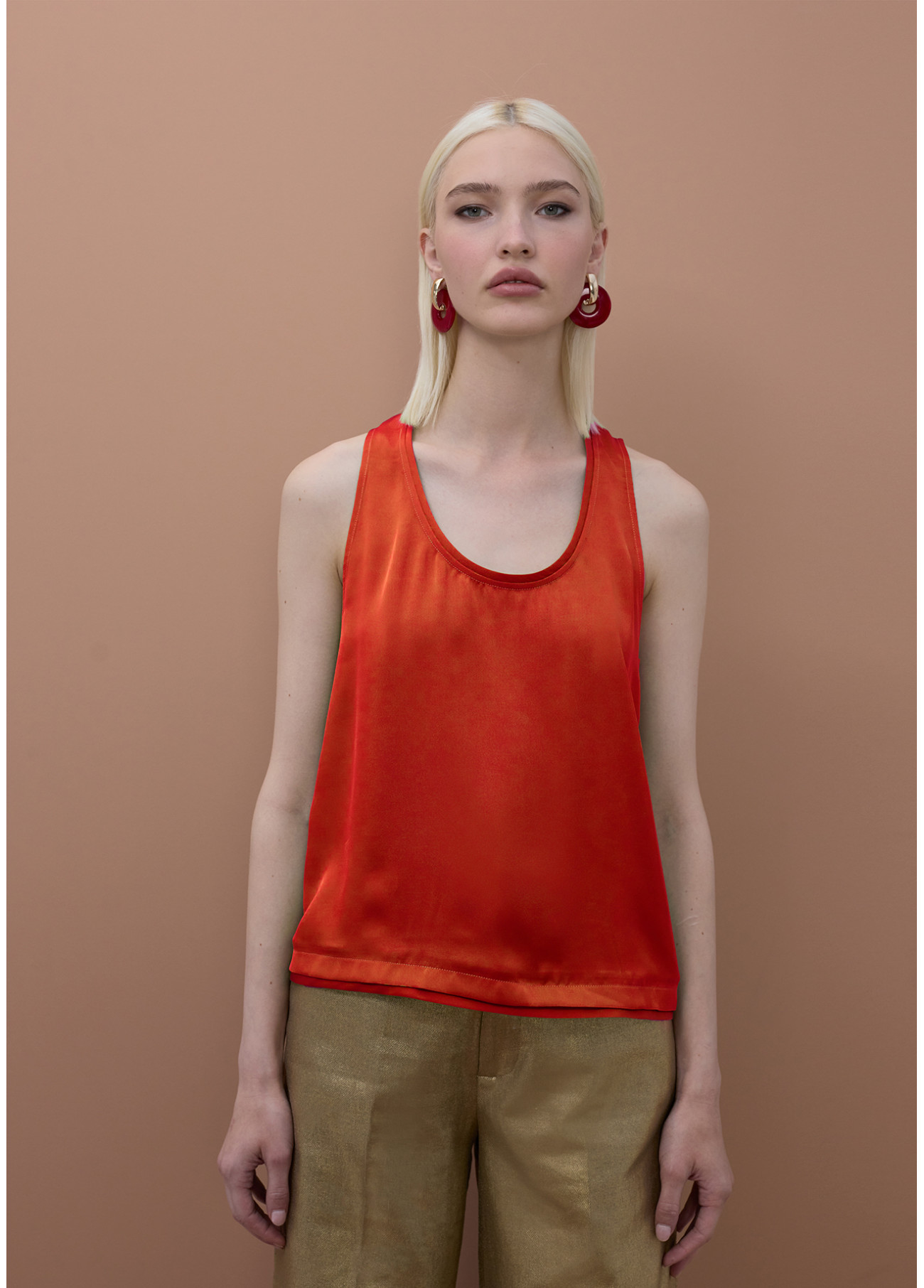 Top elegante con girocollo e dettagli profilati. Realizzato in tessuto satinato rosso che aggiunge un tocco di brillantezza. Design senza maniche ideale per giorni caldi. Perfetto per abbinare con pantaloni o gonne per un look sofisticato.