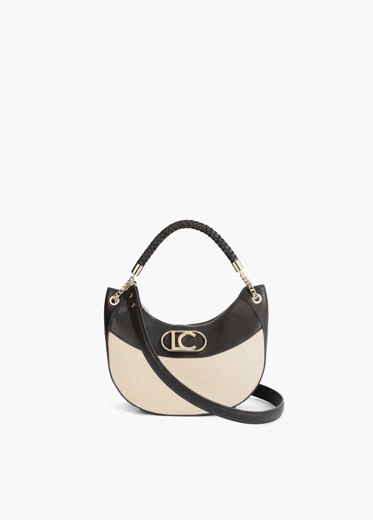 Questa elegante borsa hobo presenta un design bicolore in pelle sintetica e tela. Include manico intrecciato e dettagli dorati per un tocco di sofisticazione. Ideale per l'uso quotidiano, con chiusura a zip e ampio spazio interno.