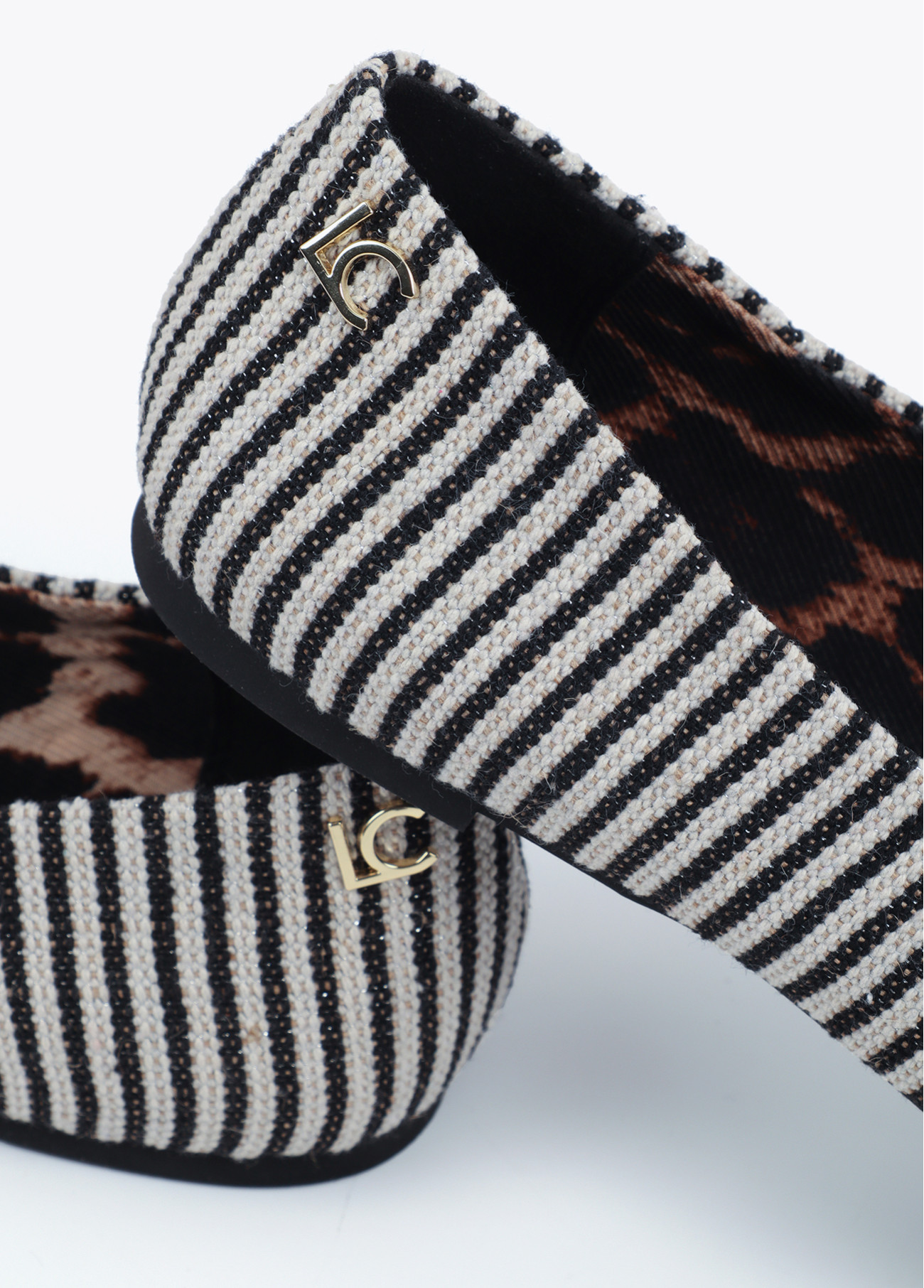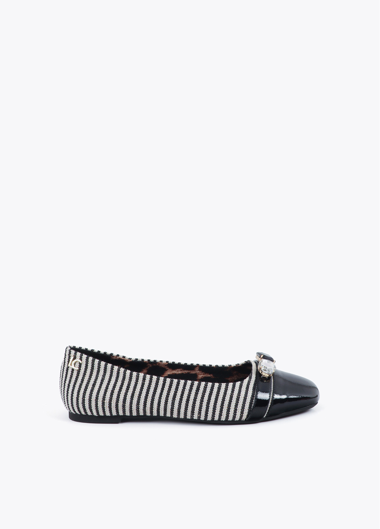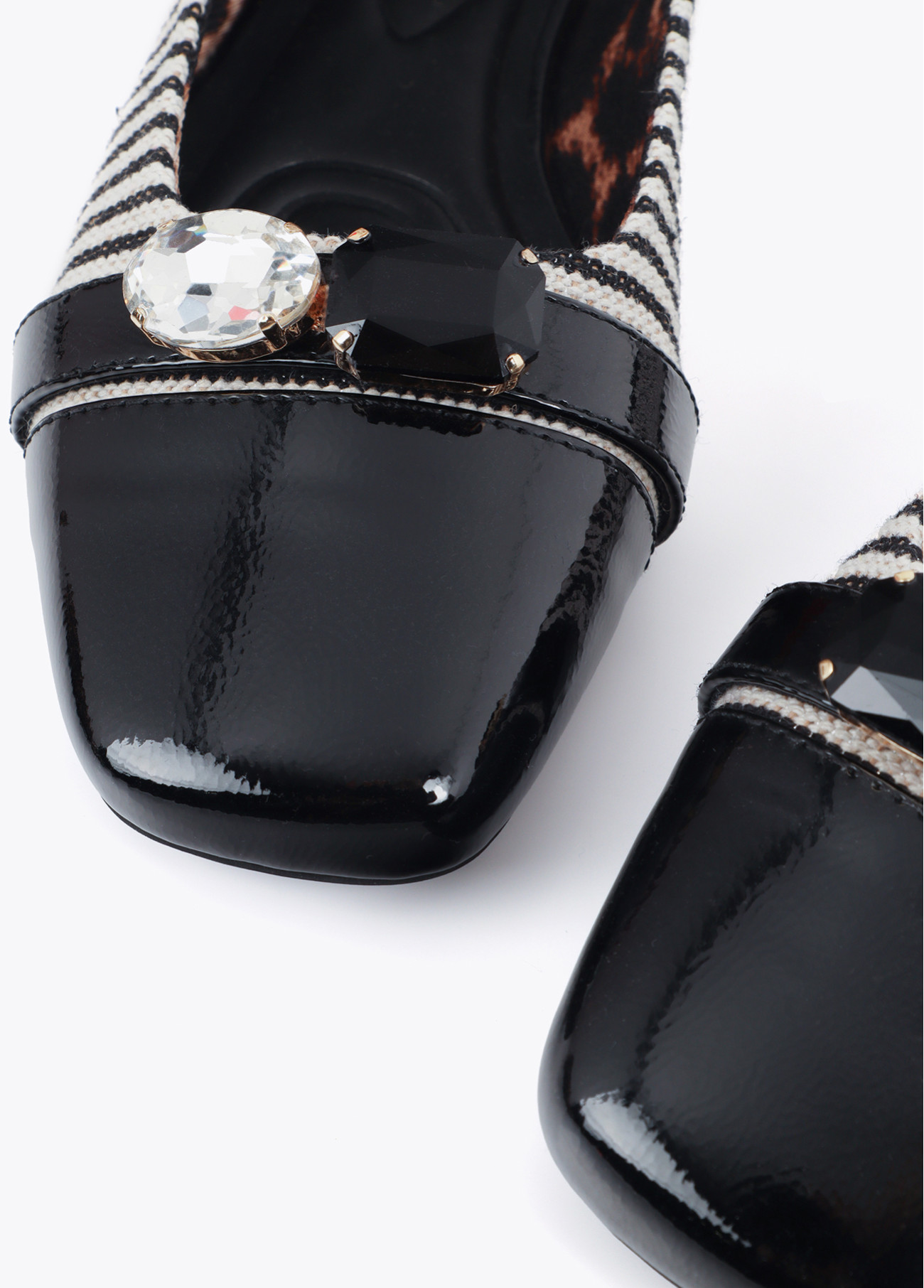 Scarpe piatte in tessuto canvas con design a righe e decorazioni di cristalli. Punta rotonda in vernice e fodera interna stampata animalier. Perfette per look casual con un tocco elegante.