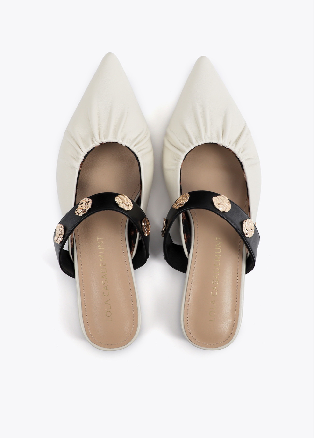 Elegante scarpa piatta con design elastico e punta affilata. Applicazioni metalliche sul cinturino per un tocco sofisticato. Perfetta per un look quotidiano con stile distinto.