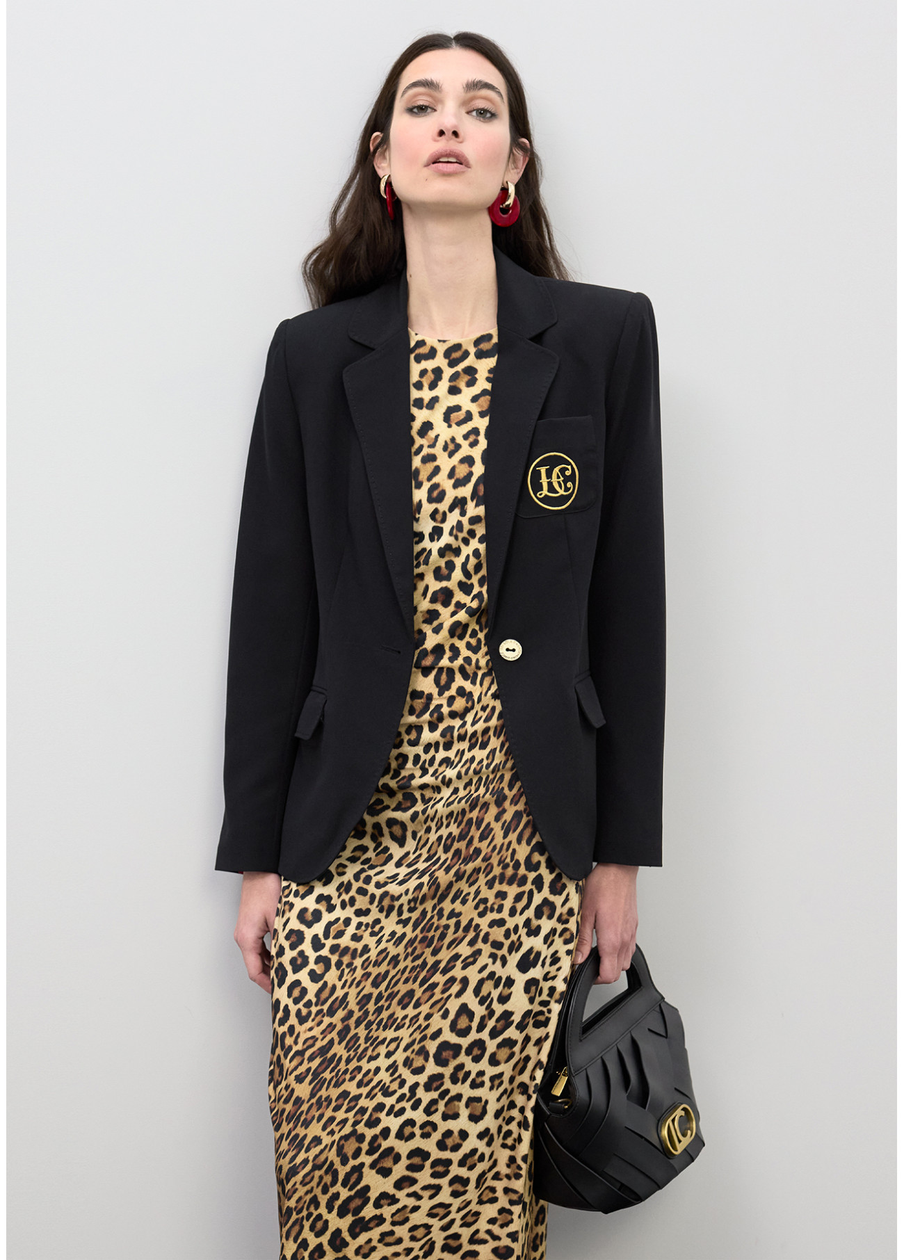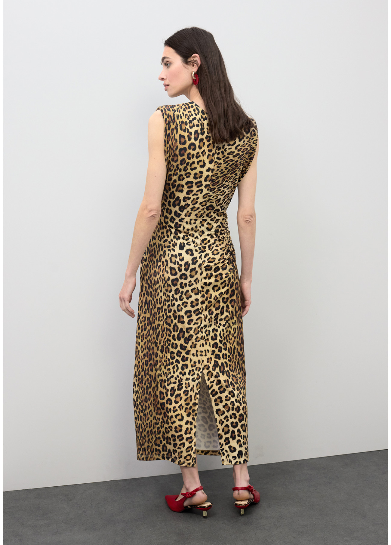 Abito midi attillato con sofisticato drappeggio laterale e stampa animale vibrante. Realizzato in tessuto leggero per una vestibilità perfetta. Ideale per risaltare a eventi speciali. Senza maniche con scollo rotondo e piccolo spacco posteriore per un tocco di eleganza.