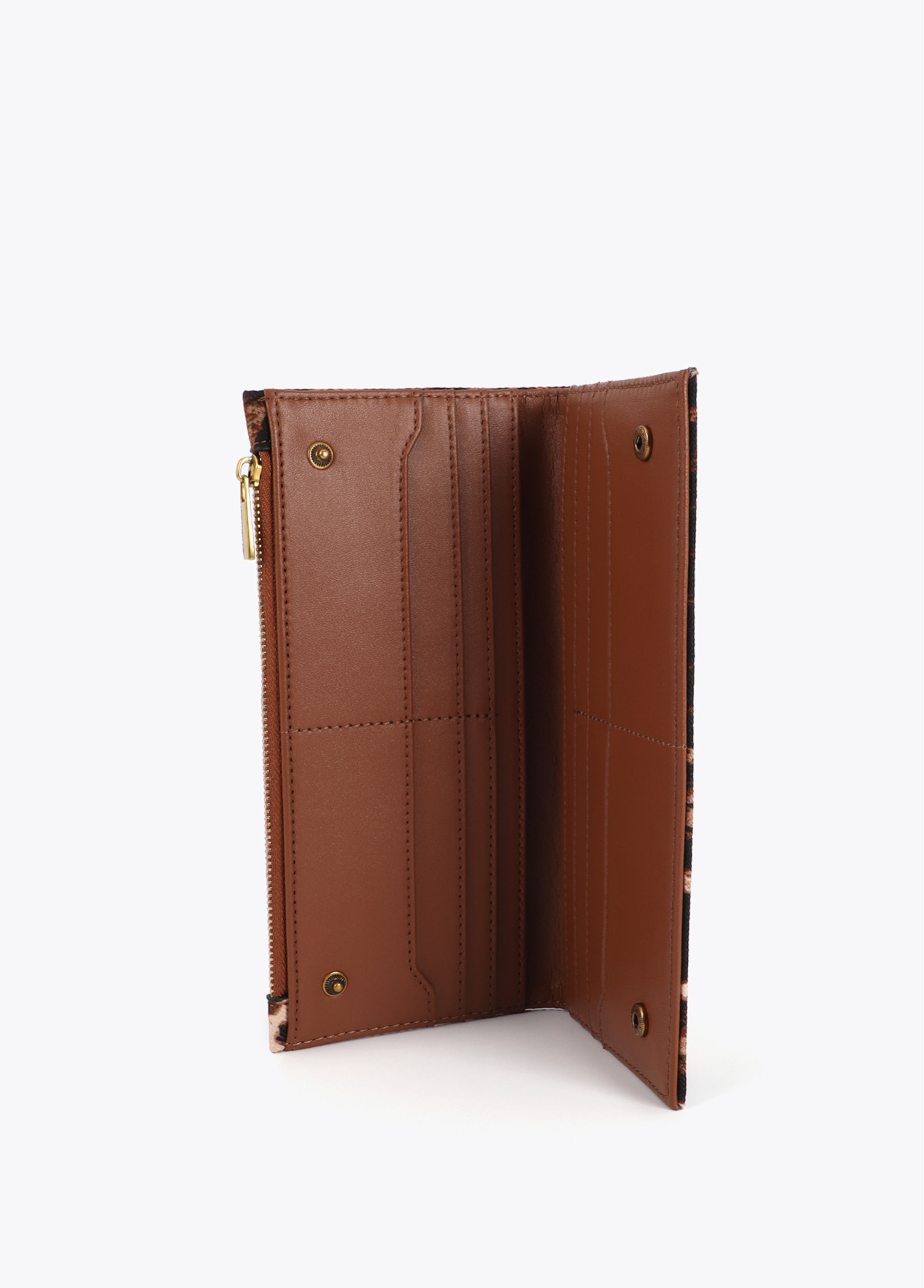 Portafoglio con elegante stampa animale e chiusura con cerniera dorata. Interno spazioso con vari scomparti per carte e banconote. Ideale per ogni occasione, combinando stile e funzionalità.