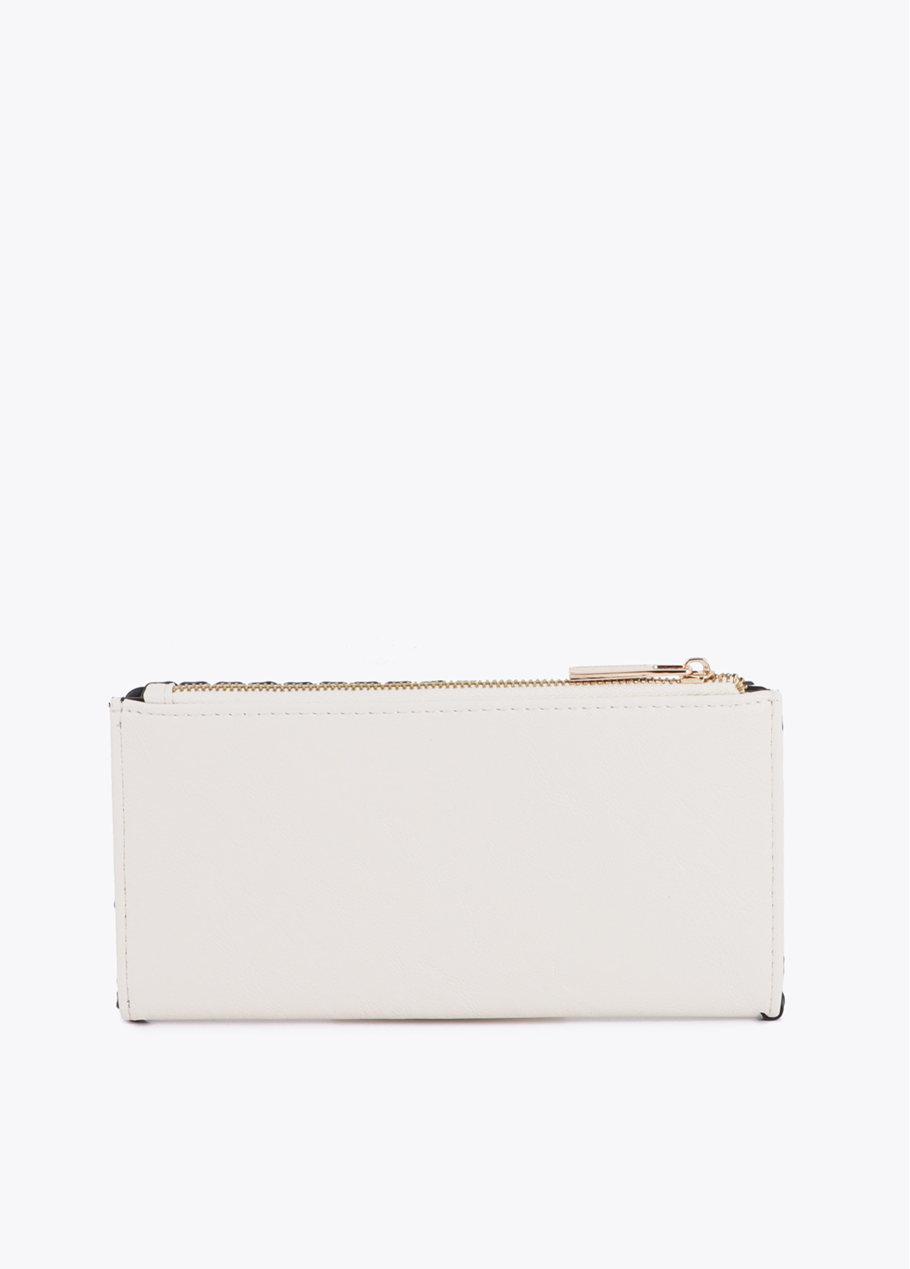 Portafoglio con elegante finitura a contrasto. Chiusura con zip. Ampi scomparti interni per carte e spazio per banconote. Dettagli di cucitura visibili e logo metallico dorato. Perfetto per aggiungere un tocco di stile alla tua vita quotidiana.