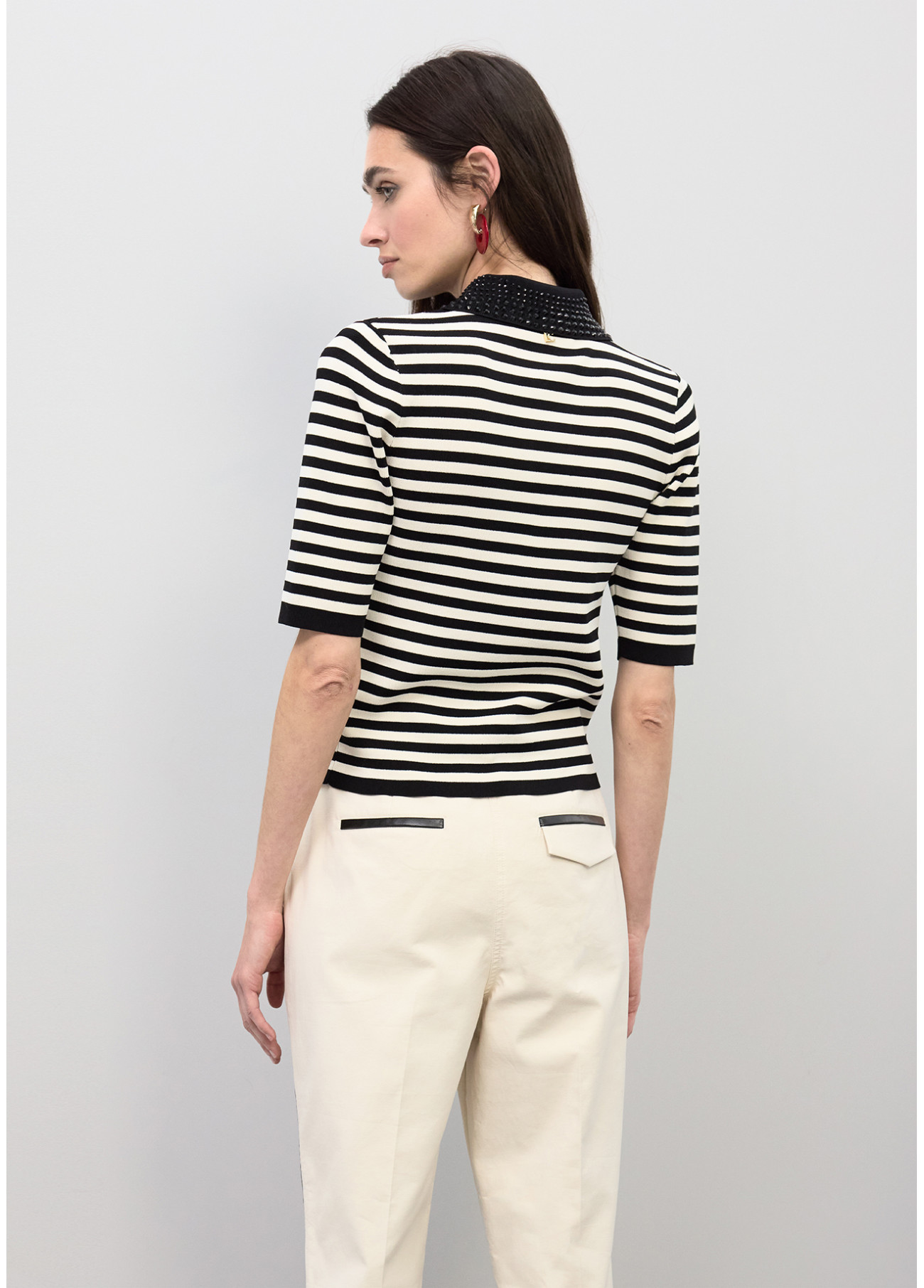 Pantaloni stile contemporaneo colore avorio con bande laterali a contrasto in P.U. Vestibilità regolare con chiusura a bottone. Tasche posteriori con dettaglio decorativo. Perfetto per un look casual chic.