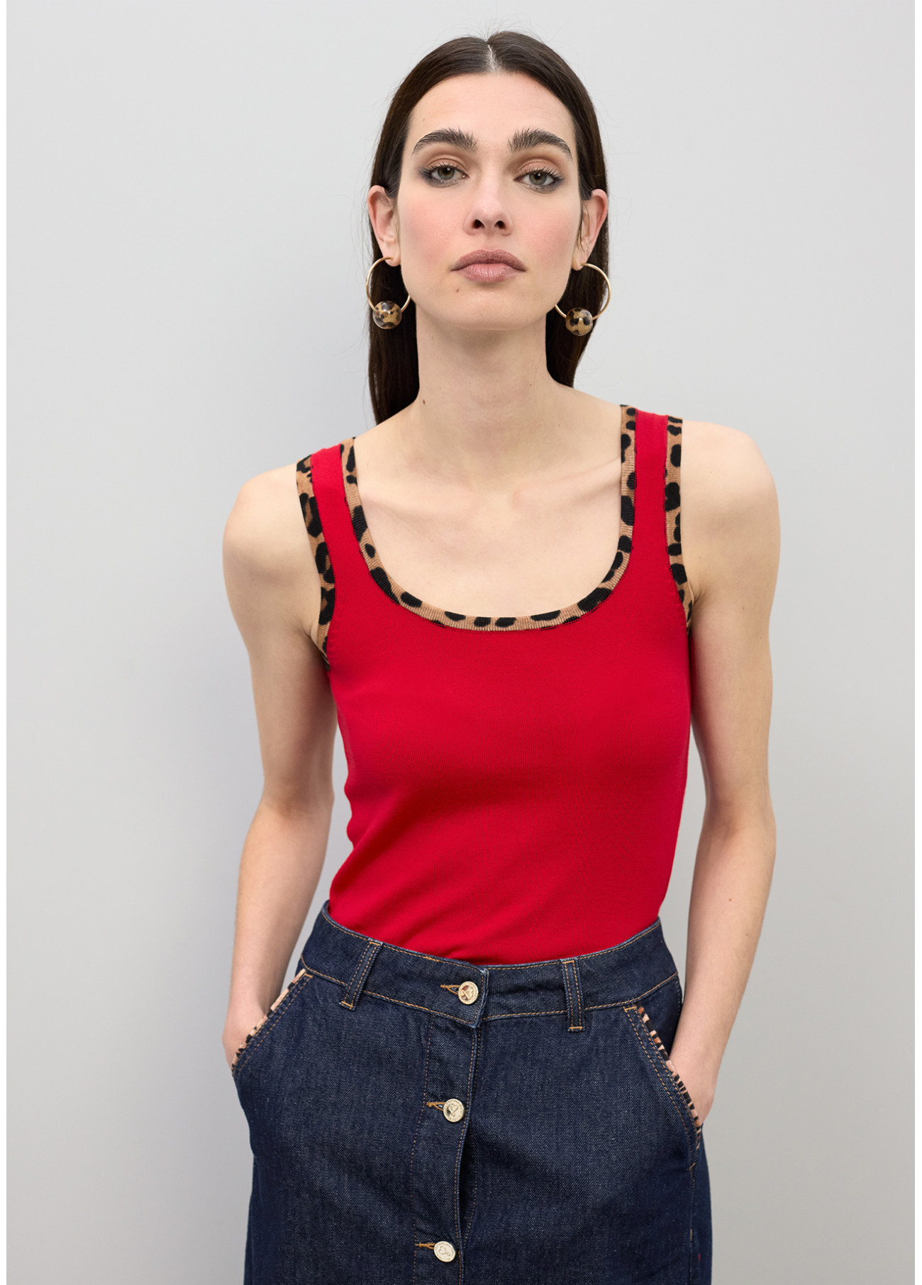 Questo top rosso presenta dettagli in rib con stampa animalier sullo scollo e le spalle. Realizzato in tessuto elastico per una vestibilità perfetta. Un design moderno che combina eleganza e un tocco di ribellione, ideale per distinguersi.