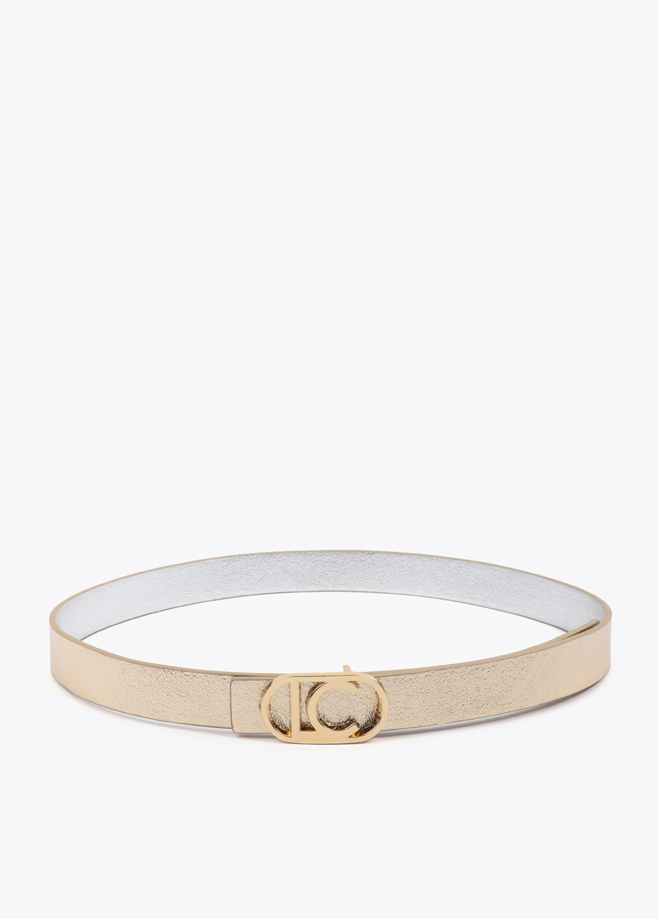 Cintura reversibile in tonalità oro e argento con elegante fibbia con logo ovale. Versatile e sofisticata, perfetta per trasformare qualsiasi look. Realizzata in materiale di alta qualità per uno stile duraturo.