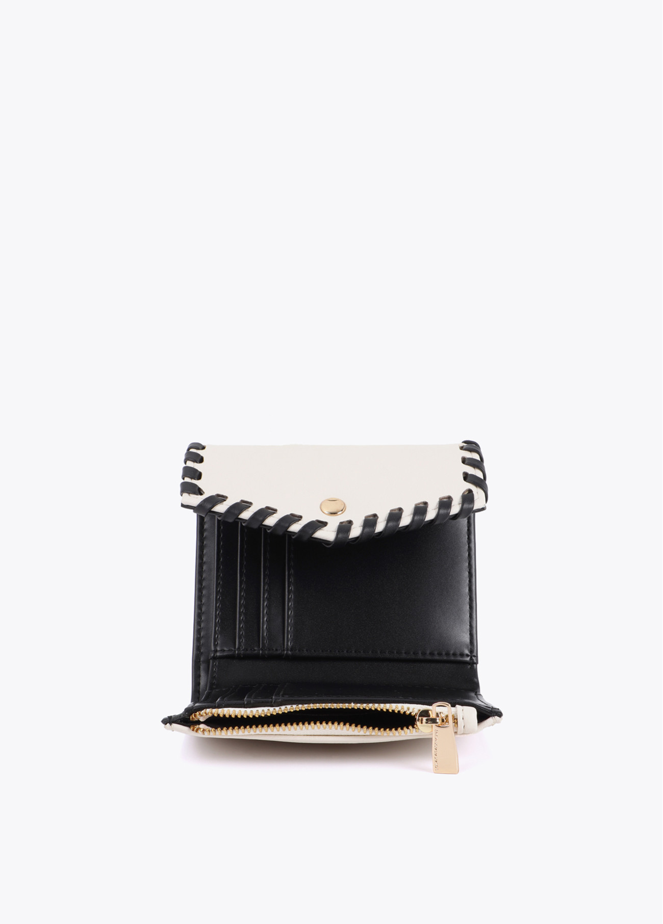Elegante portafoglio con finitura a contrasto, realizzato in ecopelle di alta qualità. Dettaglio di cucitura sulla patta e chiusura a scatto. Include diversi scomparti per carte e uno scomparto con cerniera. Ideale per l'uso quotidiano con stile e funzionalità.