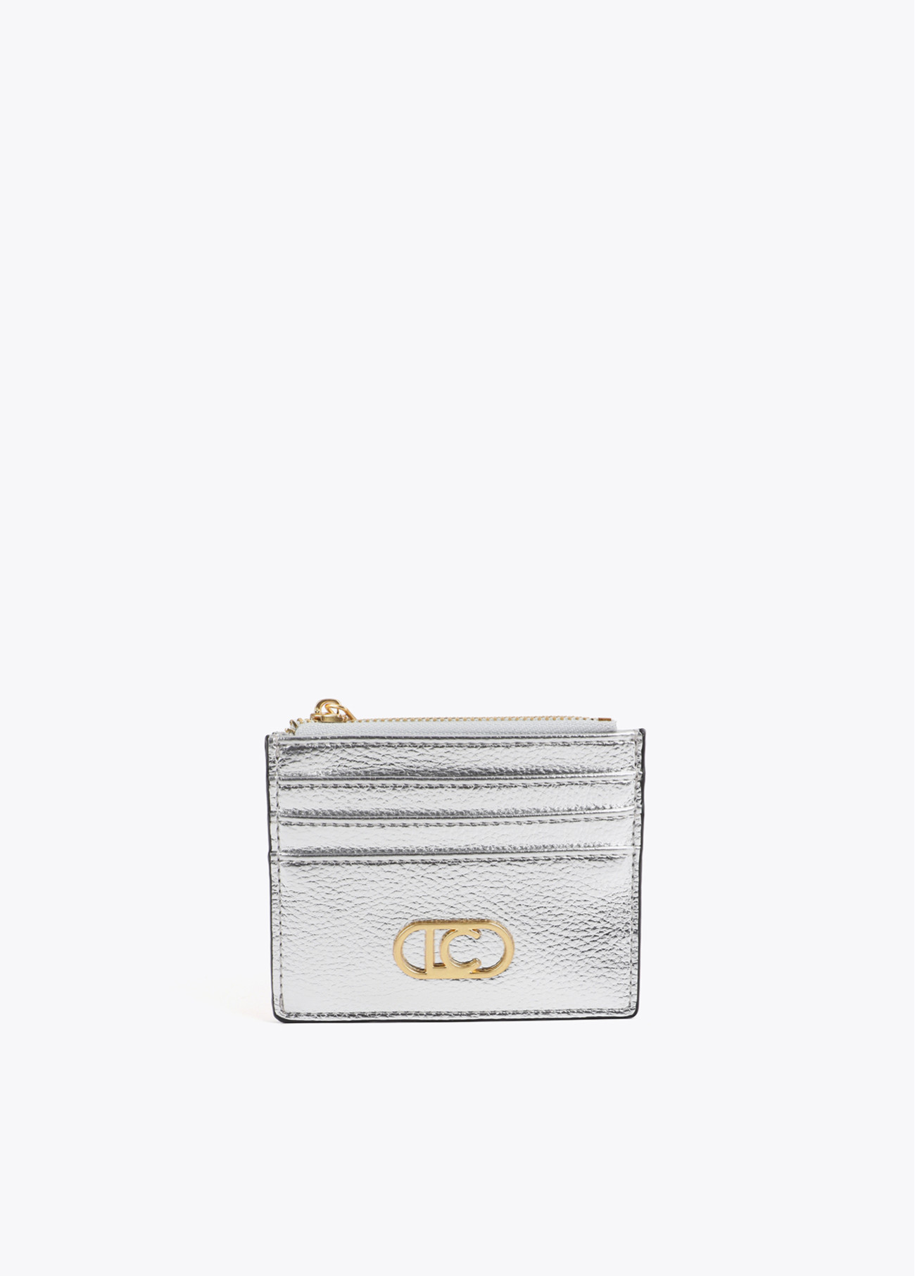 Elegante porta carte metallico con chiusura a zip. Presenta più slot per carte e logo dorato evidenziato. Design compatto e moderno, perfetto per ogni occasione.