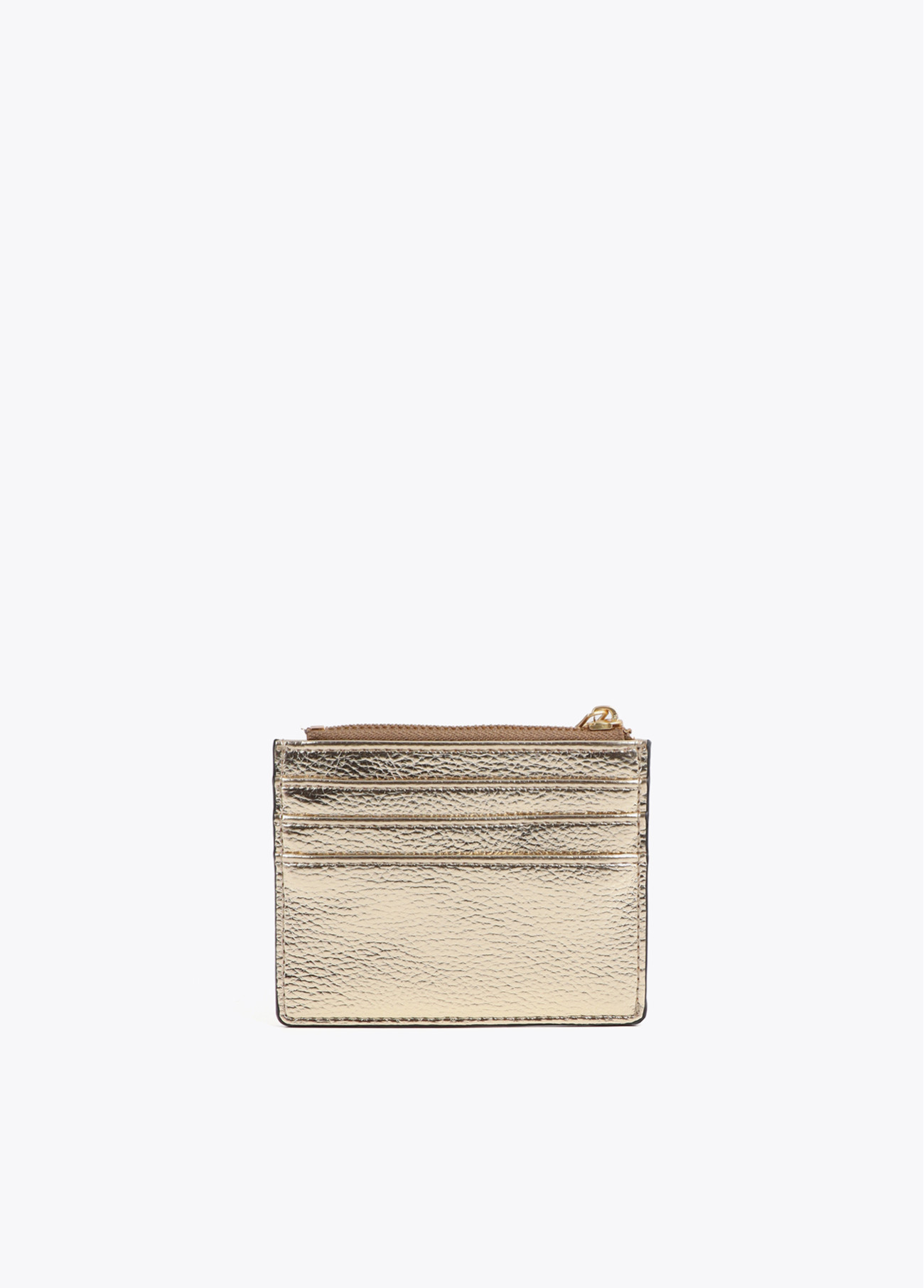 Portacarte compatto ed elegante con finitura metallizzata dorata. Dotato di più scomparti per carte e una tasca superiore con zip. Ideale per combinare stile e funzionalità.