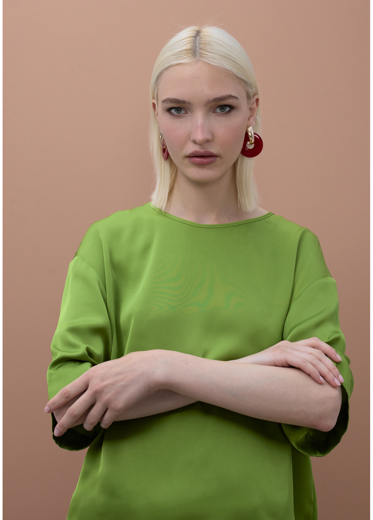 Top in seta con drappeggio elegante e taglio fluido. Progettato con maniche corte ampie e scollo rotondo per un look moderno. Perfetto per ogni occasione. Chiusura con bottoni sul retro aggiunge un tocco sofisticato. Disponibile in colore vibrante che arricchisce qualsiasi outfit.