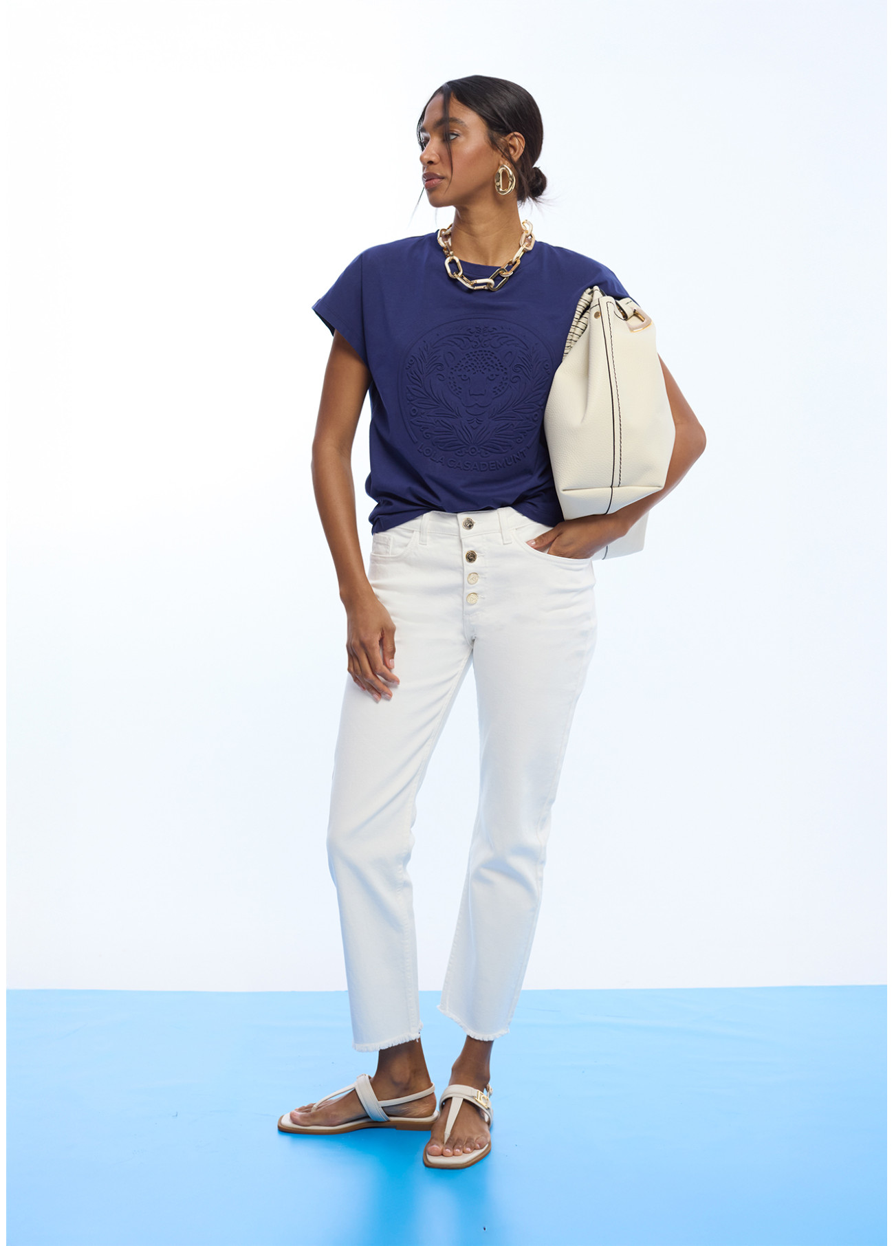 T-shirt a maniche corte in blu intenso con logo in rilievo sul davanti. Realizzata in cotone di alta qualità per un maggiore comfort. Perfetta per un look casual chic.